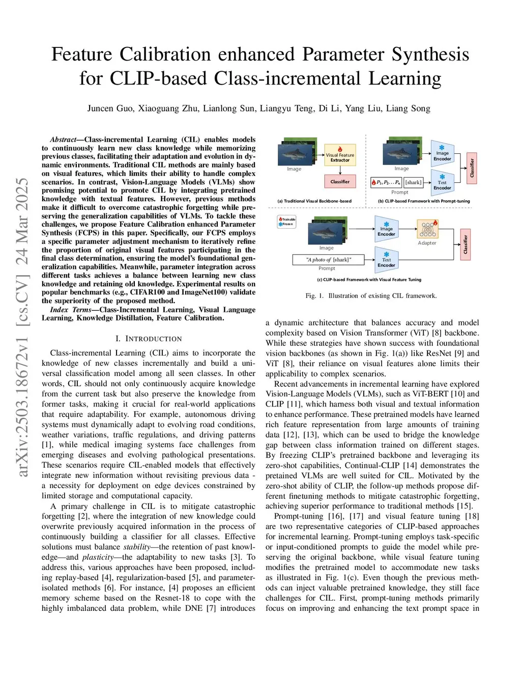Class-Incremental Learning (CIL) enables models to continuously learn new class knowledge while retaining previous classes, facilitating adaptation and evolution in dynamic, real-world environments. Traditional CIL methods primarily rely on visual features, which limits their effectiveness in complex, multimodal scenarios. In contrast, VLMs show promising potential for enhancing CIL by leveraging pre-trained knowledge and integrating multi-modal semantic cues such as text and vision. However, existing approaches struggle to mitigate catastrophic forgetting while preserving the generalization strengths of VLMs across diverse modalities. To address these challenges, we propose a Feature Calibration Enhanced Parameter Synthesis (FCPS) framework. Specifically, FCPS introduces a dynamic parameter adjustment mechanism that iteratively calibrates the contribution of original visual features to the final class decision, thus preserving the model's intrinsic generalization capability across modalities. Simultaneously, parameter integration enables effective knowledge transfer, maintaining a balance between acquiring new class representations and preserving old knowledge. Experimental results on popular benchmarks (e.g., CIFAR100 and ImageNet100) validate the superiority of the proposed method.