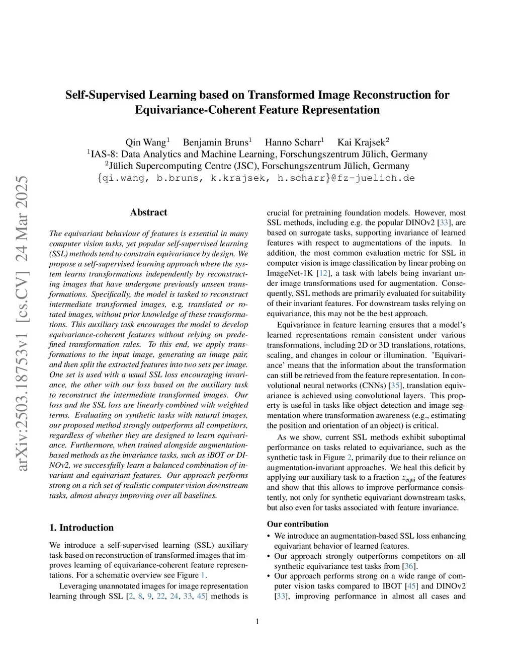 Self-Supervised Learning Based on Transformed Image Reconstruction for Equivariance-Coherent Feature Representation