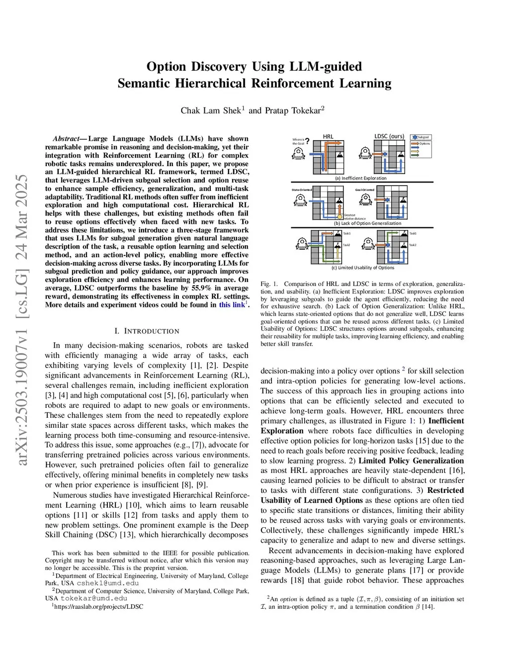 Large Language Models (LLMs) have shown remarkable promise in reasoning and decision-making, yet their integration with Reinforcement Learning (RL) for complex robotic tasks remains underexplored. In this paper, we propose an LLM-guided hierarchical RL framework, termed LDSC, that leverages LLM-driven subgoal selection and option reuse to enhance sample efficiency, generalization, and multi-task adaptability. Traditional RL methods often suffer from inefficient exploration and high computational cost. Hierarchical RL helps with these challenges, but existing methods often fail to reuse options effectively when faced with new tasks. To address these limitations, we introduce a three-stage framework that uses LLMs for subgoal generation given natural language description of the task, a reusable option learning and selection method, and an action-level policy, enabling more effective decision-making across diverse tasks. By incorporating LLMs for subgoal prediction and policy guidance, our approach improves exploration efficiency and enhances learning performance. On average, LDSC outperforms the baseline by 55.9\% in average reward, demonstrating its effectiveness in complex RL settings. More details and experiment videos could be found in \href{this https URL}{this link\footnote{this https URL}}.