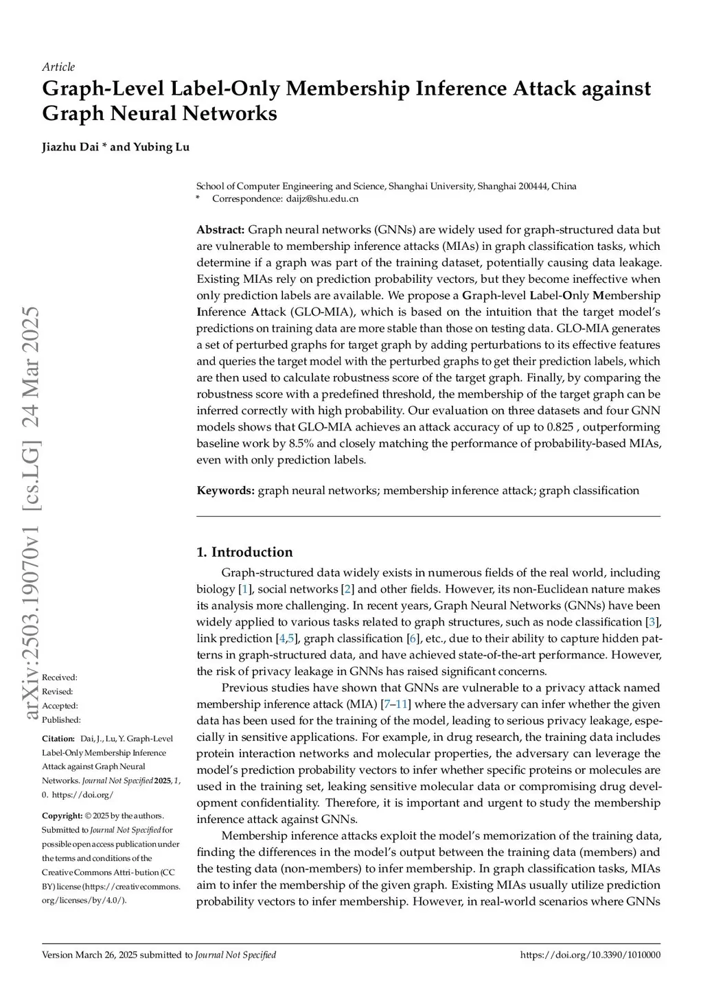 Graph neural networks (GNNs) are widely used for graph-structured data but are vulnerable to membership inference attacks (MIAs) in graph classification tasks, which determine if a graph was part of the training dataset, potentially causing data leakage. Existing MIAs rely on prediction probability vectors, but they become ineffective when only prediction labels are available. We propose a Graph-level Label-Only Membership Inference Attack (GLO-MIA), which is based on the intuition that the target model's predictions on training data are more stable than those on testing data. GLO-MIA generates a set of perturbed graphs for target graph by adding perturbations to its effective features and queries the target model with the perturbed graphs to get their prediction labels, which are then used to calculate robustness score of the target graph. Finally, by comparing the robustness score with a predefined threshold, the membership of the target graph can be inferred correctly with high probability. Our evaluation on three datasets and four GNN models shows that GLO-MIA achieves an attack accuracy of up to 0.825, outperforming baseline work by 8.5% and closely matching the performance of probability-based MIAs, even with only prediction labels.