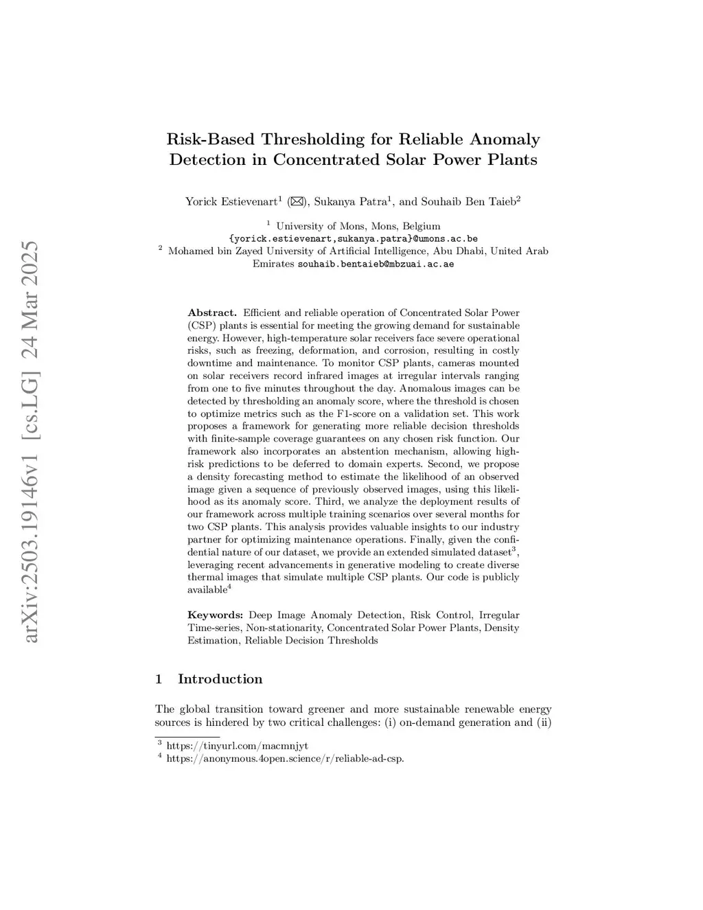 Efficient and reliable operation of Concentrated Solar Power (CSP) plants is essential for meeting the growing demand for sustainable energy. However, high-temperature solar receivers face severe operational risks, such as freezing, deformation, and corrosion, resulting in costly downtime and maintenance. To monitor CSP plants, cameras mounted on solar receivers record infrared images at irregular intervals ranging from one to five minutes throughout the day. Anomalous images can be detected by thresholding an anomaly score, where the threshold is chosen to optimize metrics such as the F1-score on a validation set. This work proposes a framework, using risk control, for generating more reliable decision thresholds with finite-sample coverage guarantees on any chosen risk function. Our framework also incorporates an abstention mechanism, allowing high-risk predictions to be deferred to domain experts. Second, we propose a density forecasting method to estimate the likelihood of an observed image given a sequence of previously observed images, using this likelihood as its anomaly score. Third, we analyze the deployment results of our framework across multiple training scenarios over several months for two CSP plants. This analysis provides valuable insights to our industry partner for optimizing maintenance operations. Finally, given the confidential nature of our dataset, we provide an extended simulated dataset, leveraging recent advancements in generative modeling to create diverse thermal images that simulate multiple CSP plants. Our code is publicly available.