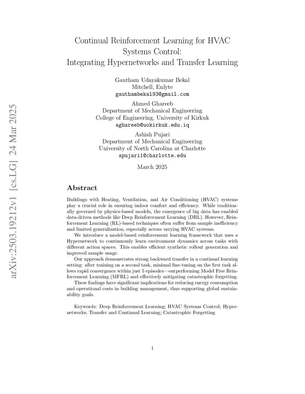 Buildings with Heating, Ventilation, and Air Conditioning (HVAC) systems play a crucial role in ensuring indoor comfort and efficiency. While traditionally governed by physics-based models, the emergence of big data has enabled data-driven methods like Deep Reinforcement Learning (DRL). However, Reinforcement Learning (RL)-based techniques often suffer from sample inefficiency and limited generalization, especially across varying HVAC systems. We introduce a model-based reinforcement learning framework that uses a Hypernetwork to continuously learn environment dynamics across tasks with different action spaces. This enables efficient synthetic rollout generation and improved sample usage. Our approach demonstrates strong backward transfer in a continual learning setting after training on a second task, minimal fine-tuning on the first task allows rapid convergence within just 5 episodes and thus outperforming Model Free Reinforcement Learning (MFRL) and effectively mitigating catastrophic forgetting. These findings have significant implications for reducing energy consumption and operational costs in building management, thus supporting global sustainability goals.Keywords: Deep Reinforcement Learning, HVAC Systems Control, Hypernetworks, Transfer and Continual Learning, Catastrophic Forgetting