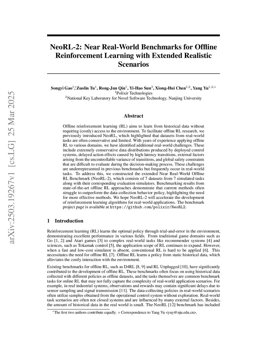 Offline reinforcement learning (RL) aims to learn from historical data without requiring (costly) access to the environment. To facilitate offline RL research, we previously introduced NeoRL, which highlighted that datasets from real-world tasks are often conservative and limited. With years of experience applying offline RL to various domains, we have identified additional real-world challenges. These include extremely conservative data distributions produced by deployed control systems, delayed action effects caused by high-latency transitions, external factors arising from the uncontrollable variance of transitions, and global safety constraints that are difficult to evaluate during the decision-making process. These challenges are underrepresented in previous benchmarks but frequently occur in real-world tasks. To address this, we constructed the extended Near Real-World Offline RL Benchmark (NeoRL-2), which consists of 7 datasets from 7 simulated tasks along with their corresponding evaluation simulators. Benchmarking results from state-of-the-art offline RL approaches demonstrate that current methods often struggle to outperform the data-collection behavior policy, highlighting the need for more effective methods. We hope NeoRL-2 will accelerate the development of reinforcement learning algorithms for real-world applications. The benchmark project page is available atthis https URL.