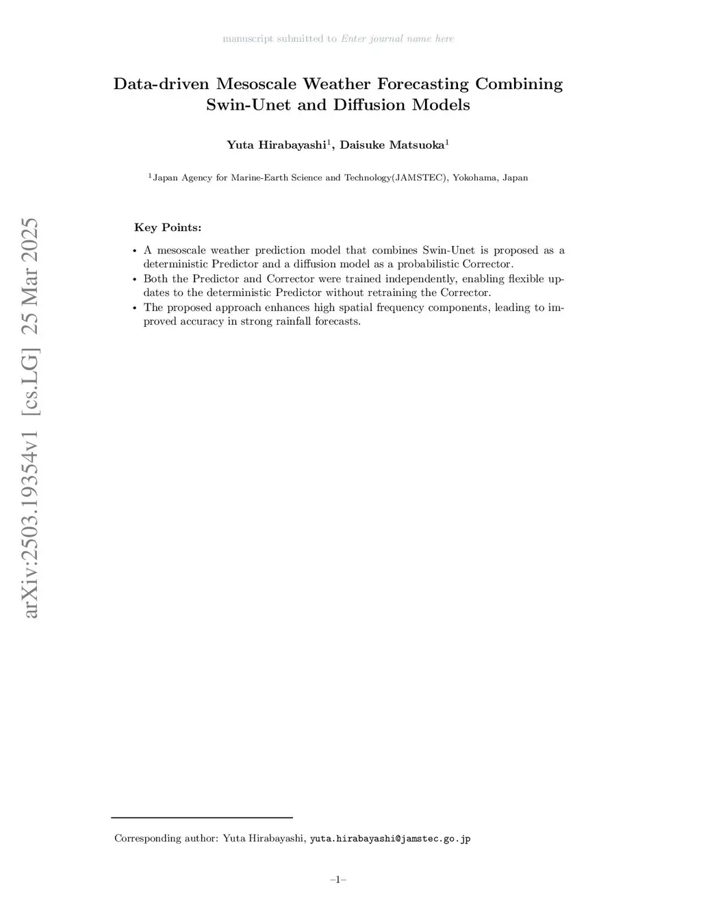 Data-driven weather prediction models exhibit promising performance and advance continuously. In particular, diffusion models represent fine-scale details without spatial smoothing, which is crucial for mesoscale predictions, such as heavy rainfall forecasting. However, the applications of diffusion models to mesoscale prediction remain limited. To address this gap, this study proposes an architecture that combines a diffusion model with Swin-Unet as a deterministic model, achieving mesoscale predictions while maintaining flexibility. The proposed architecture trains the two models independently, allowing the diffusion model to remain unchanged when the deterministic model is updated. Comparisons using the Fractions Skill Score and power spectral analysis demonstrate that incorporating the diffusion model leads to improved accuracy compared to predictions without it. These findings underscore the potential of the proposed architecture to enhance mesoscale predictions, particularly for strong rainfall events, while maintaining flexibility.