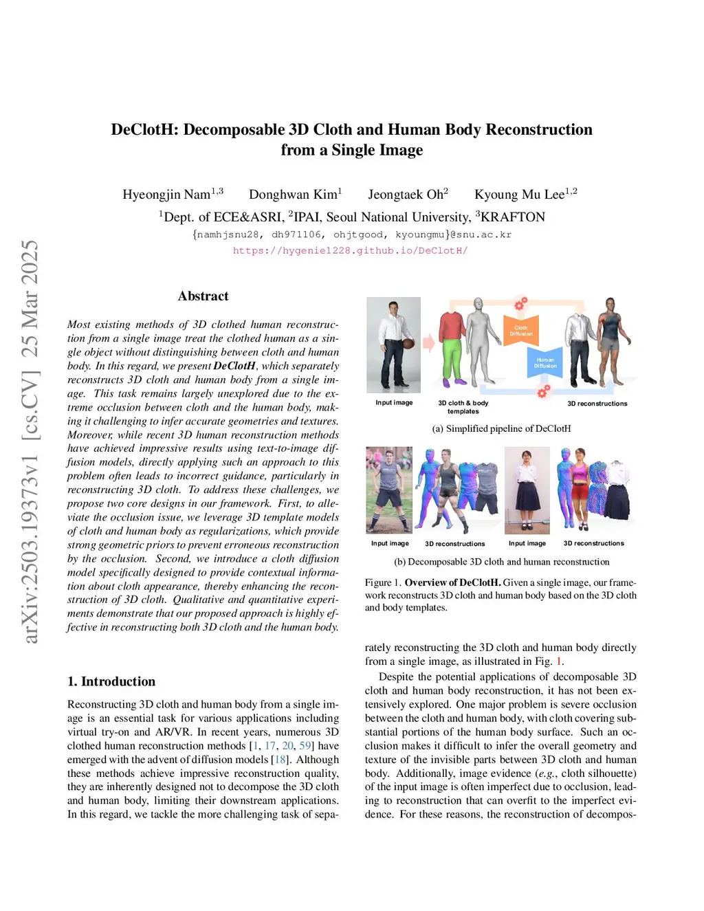 Most existing methods of 3D clothed human reconstruction from a single image treat the clothed human as a single object without distinguishing between cloth and human body. In this regard, we present DeClotH, which separately reconstructs 3D cloth and human body from a single image. This task remains largely unexplored due to the extreme occlusion between cloth and the human body, making it challenging to infer accurate geometries and textures. Moreover, while recent 3D human reconstruction methods have achieved impressive results using text-to-image diffusion models, directly applying such an approach to this problem often leads to incorrect guidance, particularly in reconstructing 3D cloth. To address these challenges, we propose two core designs in our framework. First, to alleviate the occlusion issue, we leverage 3D template models of cloth and human body as regularizations, which provide strong geometric priors to prevent erroneous reconstruction by the occlusion. Second, we introduce a cloth diffusion model specifically designed to provide contextual information about cloth appearance, thereby enhancing the reconstruction of 3D cloth. Qualitative and quantitative experiments demonstrate that our proposed approach is highly effective in reconstructing both 3D cloth and the human body. More qualitative results are provided atthis https URL.