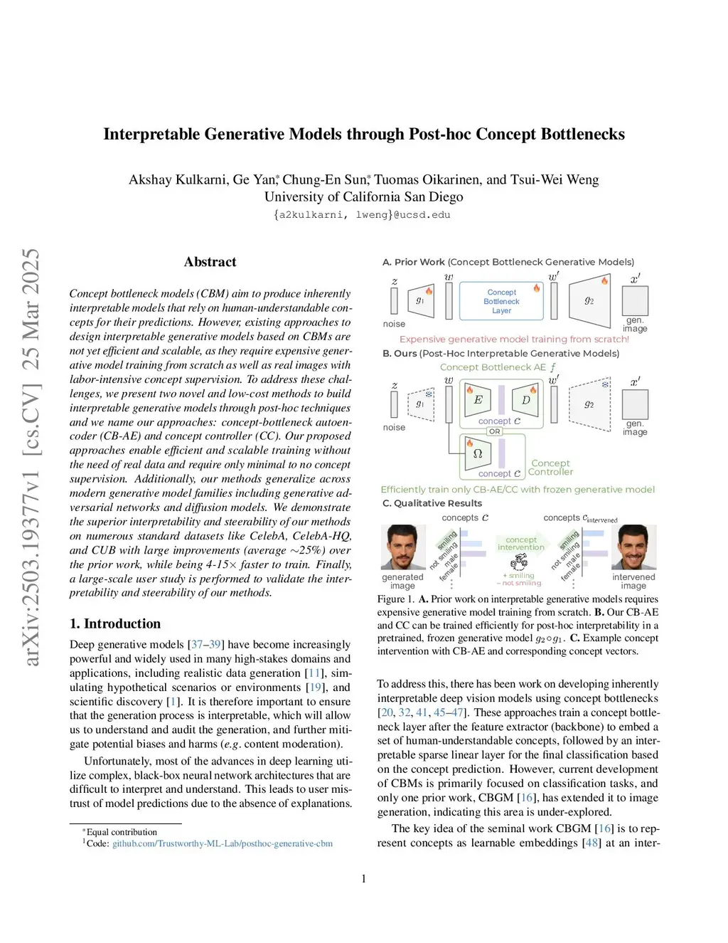 Concept bottleneck models (CBM) aim to produce inherently interpretable models that rely on human-understandable concepts for their predictions. However, existing approaches to design interpretable generative models based on CBMs are not yet efficient and scalable, as they require expensive generative model training from scratch as well as real images with labor-intensive concept supervision. To address these challenges, we present two novel and low-cost methods to build interpretable generative models through post-hoc techniques and we name our approaches: concept-bottleneck autoencoder (CB-AE) and concept controller (CC). Our proposed approaches enable efficient and scalable training without the need of real data and require only minimal to no concept supervision. Additionally, our methods generalize across modern generative model families including generative adversarial networks and diffusion models. We demonstrate the superior interpretability and steerability of our methods on numerous standard datasets like CelebA, CelebA-HQ, and CUB with large improvements (average ~25%) over the prior work, while being 4-15x faster to train. Finally, a large-scale user study is performed to validate the interpretability and steerability of our methods.