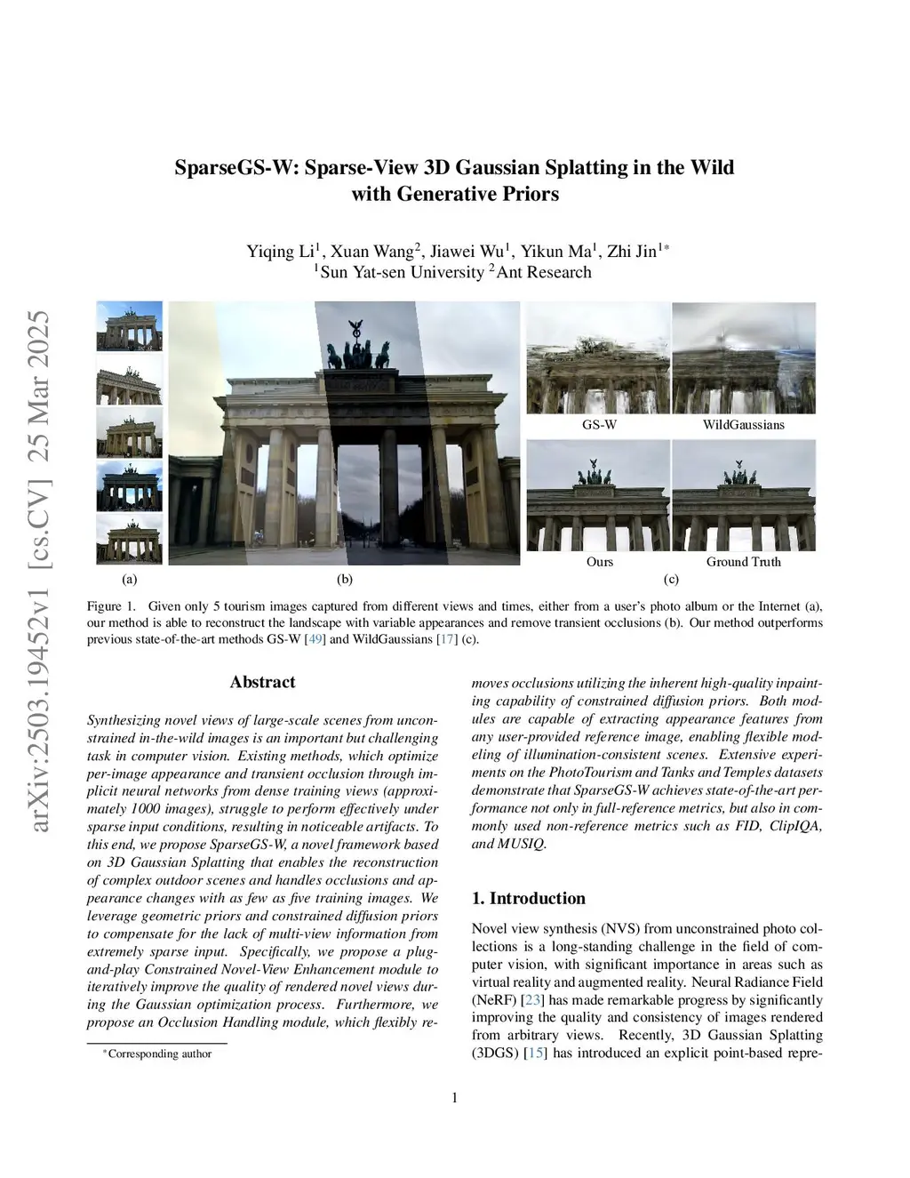 SparseGS-W: Sparse-View 3D Gaussian Splatting in the Wild with Generative Priors