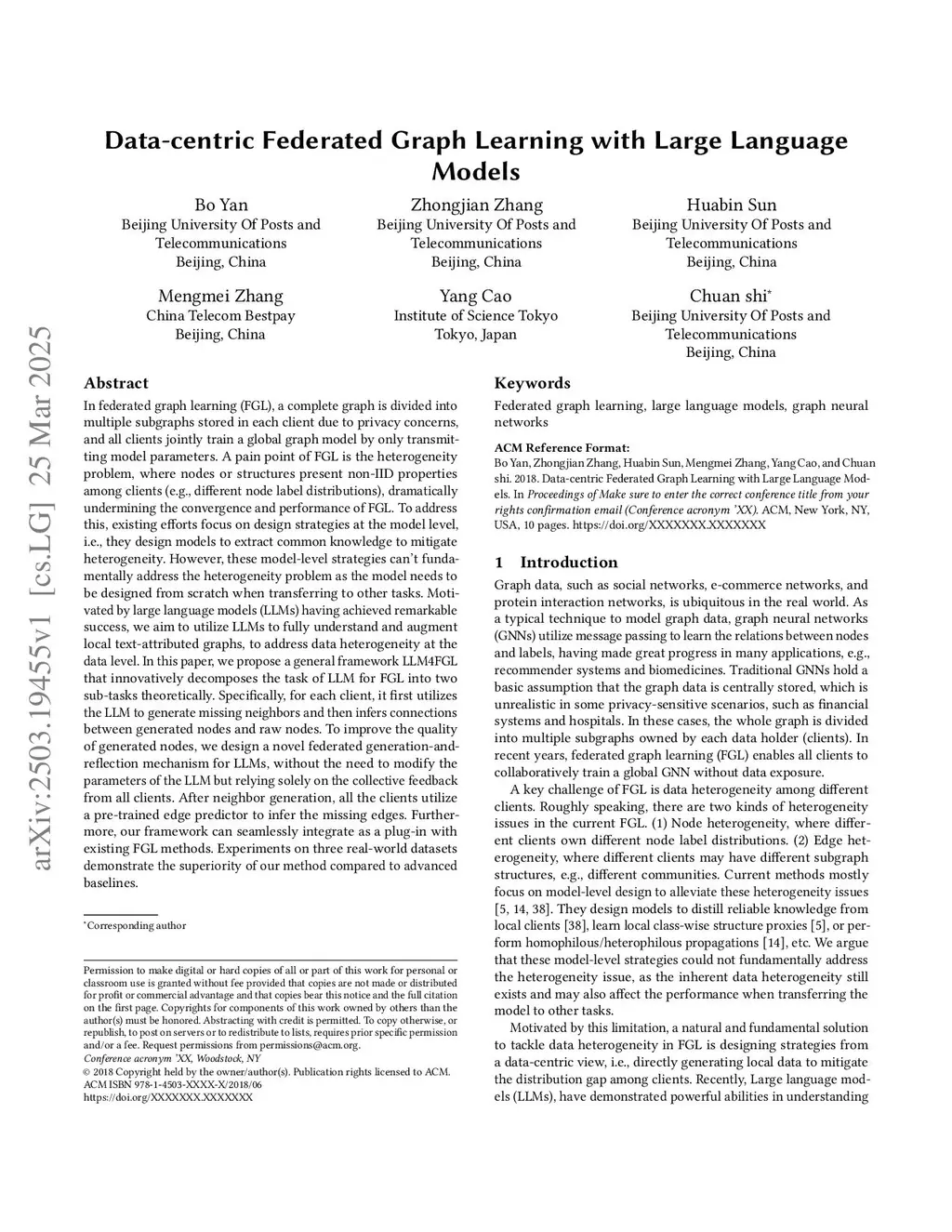 In federated graph learning (FGL), a complete graph is divided into multiple subgraphs stored in each client due to privacy concerns, and all clients jointly train a global graph model by only transmitting model parameters. A pain point of FGL is the heterogeneity problem, where nodes or structures present non-IID properties among clients (e.g., different node label distributions), dramatically undermining the convergence and performance of FGL. To address this, existing efforts focus on design strategies at the model level, i.e., they design models to extract common knowledge to mitigate heterogeneity. However, these model-level strategies fail to fundamentally address the heterogeneity problem as the model needs to be designed from scratch when transferring to other tasks. Motivated by large language models (LLMs) having achieved remarkable success, we aim to utilize LLMs to fully understand and augment local text-attributed graphs, to address data heterogeneity at the data level. In this paper, we propose a general framework LLM4FGL that innovatively decomposes the task of LLM for FGL into two sub-tasks theoretically. Specifically, for each client, it first utilizes the LLM to generate missing neighbors and then infers connections between generated nodes and raw nodes. To improve the quality of generated nodes, we design a novel federated generation-and-reflection mechanism for LLMs, without the need to modify the parameters of the LLM but relying solely on the collective feedback from all clients. After neighbor generation, all the clients utilize a pre-trained edge predictor to infer the missing edges. Furthermore, our framework can seamlessly integrate as a plug-in with existing FGL methods. Experiments on three real-world datasets demonstrate the superiority of our method compared to advanced baselines.