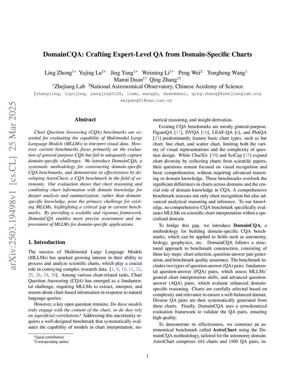 Chart Question Answering (CQA) evaluates Multimodal Large Language Models (MLLMs) on visual understanding and reasoning over chart data. However, existing benchmarks mostly test surface-level parsing, such as reading labels and legends, while overlooking deeper scientific reasoning. We propose DomainCQA, a framework for constructing domain-specific CQA benchmarks that emphasize both visual comprehension and knowledge-intensive reasoning. It integrates complexity-aware chart selection, multitier QA generation, and expert validation. Applied to astronomy, DomainCQA yields AstroChart, a benchmark of 1,690 QA pairs over 482 charts, exposing persistent weaknesses in fine-grained perception, numerical reasoning, and domain knowledge integration across 21 MLLMs. Fine-tuning on AstroChart improves performance across fundamental and advanced tasks. Pilot QA sets in biochemistry, economics, medicine, and social science further demonstrate DomainCQA's generality. Together, our results establish DomainCQA as a unified pipeline for constructing and augmenting domain-specific chart reasoning benchmarks.