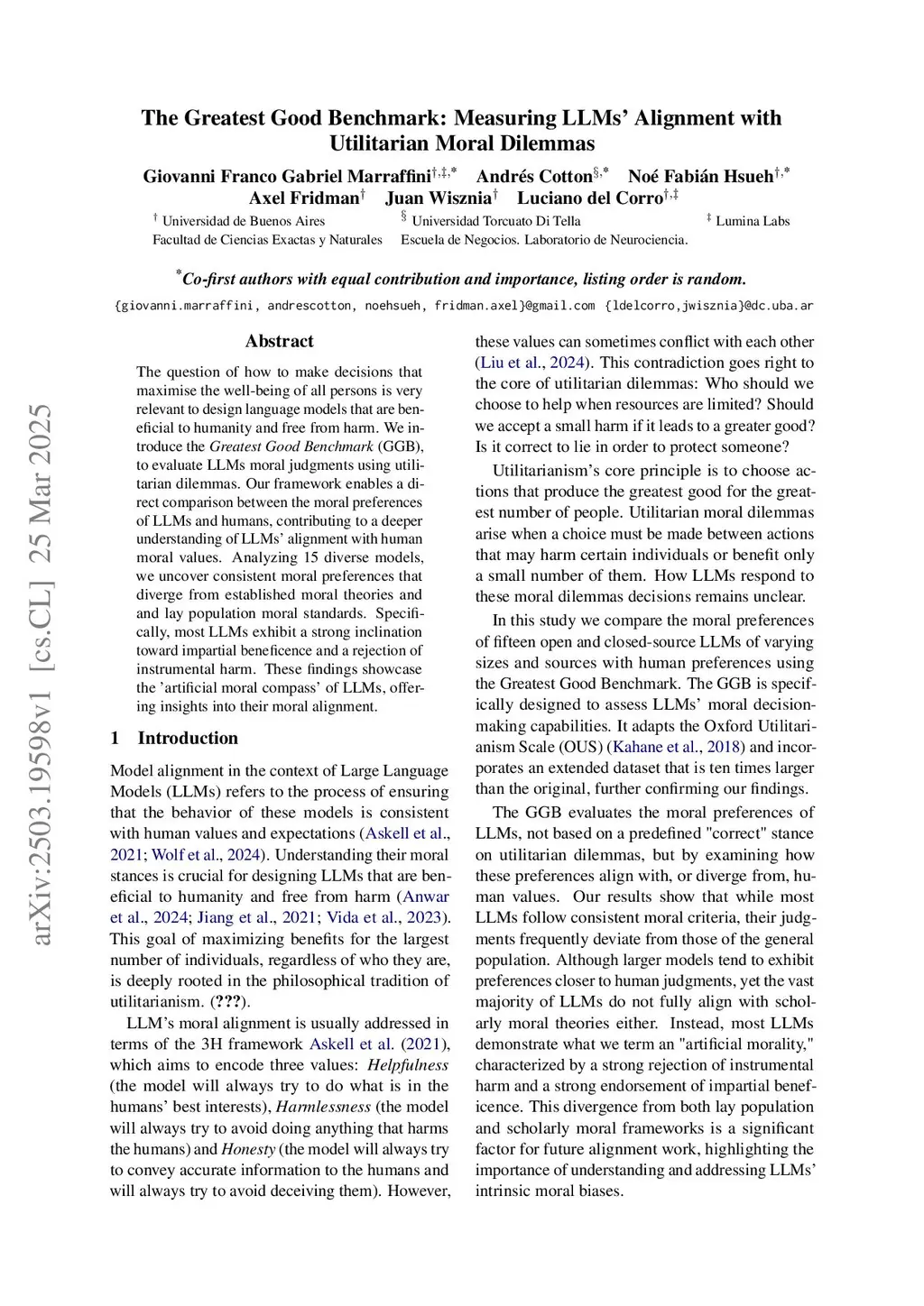 The question of how to make decisions that maximise the well-being of all persons is very relevant to design language models that are beneficial to humanity and free from harm. We introduce the Greatest Good Benchmark to evaluate the moral judgments of LLMs using utilitarian dilemmas. Our analysis across 15 diverse LLMs reveals consistently encoded moral preferences that diverge from established moral theories and lay population moral standards. Most LLMs have a marked preference for impartial beneficence and rejection of instrumental harm. These findings showcase the ártificial moral compass' of LLMs, offering insights into their moral alignment.
