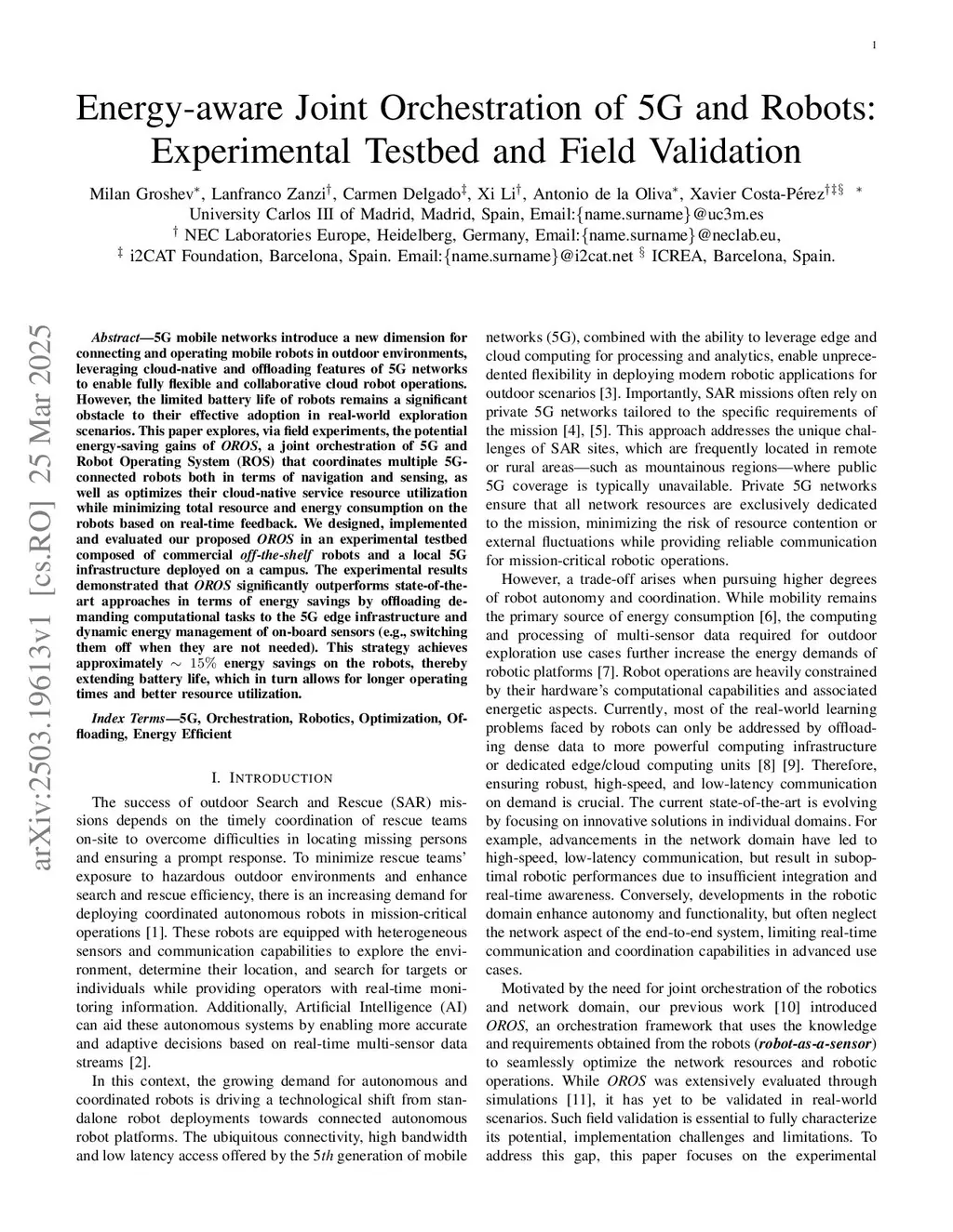 5G mobile networks introduce a new dimension for connecting and operating mobile robots in outdoor environments, leveraging cloud-native and offloading features of 5G networks to enable fully flexible and collaborative cloud robot operations. However, the limited battery life of robots remains a significant obstacle to their effective adoption in real-world exploration scenarios. This paper explores, via field experiments, the potential energy-saving gains of OROS, a joint orchestration of 5G and Robot Operating System (ROS) that coordinates multiple 5G-connected robots both in terms of navigation and sensing, as well as optimizes their cloud-native service resource utilization while minimizing total resource and energy consumption on the robots based on real-time feedback. We designed, implemented and evaluated our proposed OROS in an experimental testbed composed of commercial off-the-shelf robots and a local 5G infrastructure deployed on a campus. The experimental results demonstrated that OROS significantly outperforms state-of-the-art approaches in terms of energy savings by offloading demanding computational tasks to the 5G edge infrastructure and dynamic energy management of on-board sensors (e.g., switching them off when they are not needed). This strategy achieves approximately 15% energy savings on the robots, thereby extending battery life, which in turn allows for longer operating times and better resource utilization.