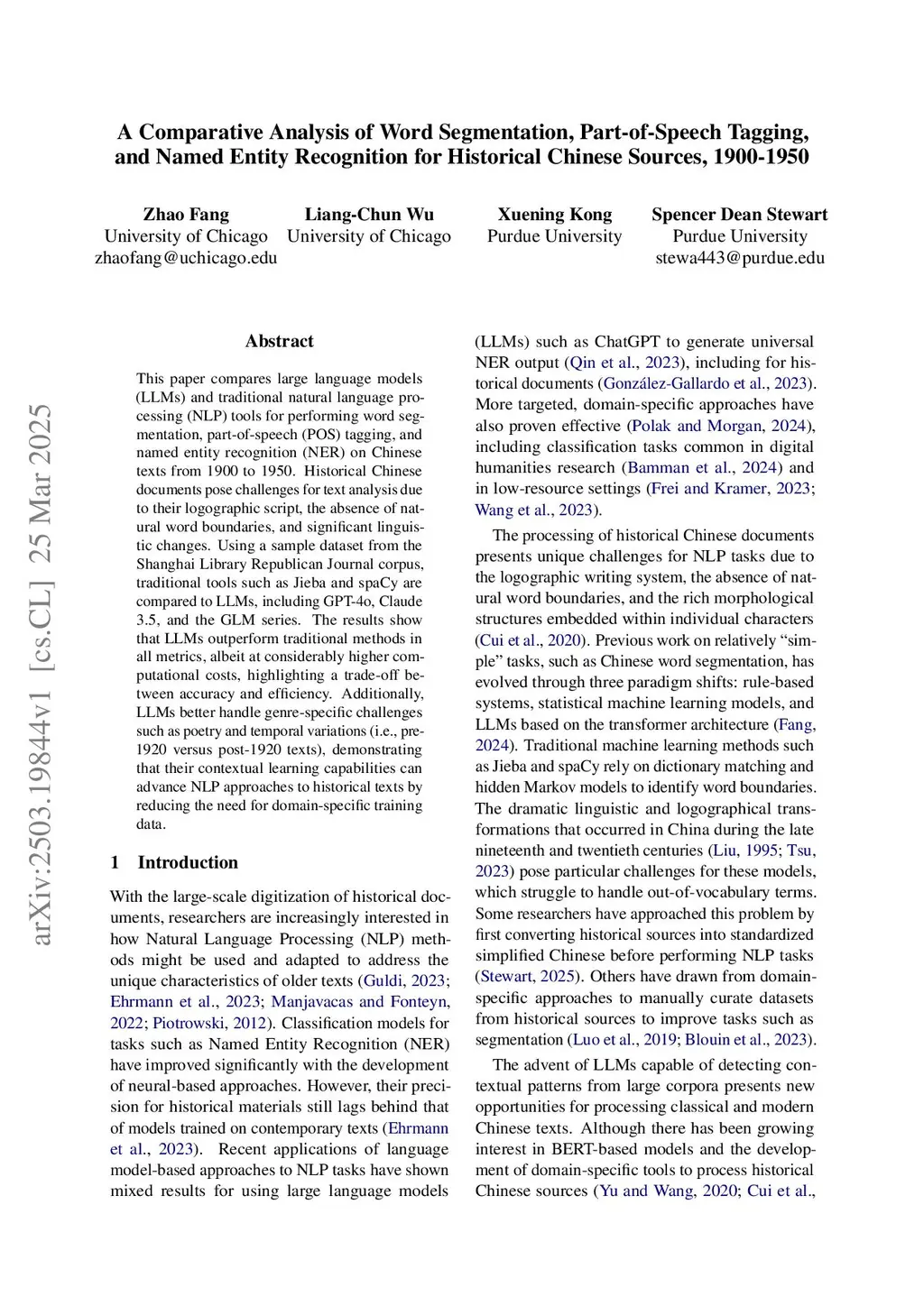 This paper compares large language models (LLMs) and traditional natural language processing (NLP) tools for performing word segmentation, part-of-speech (POS) tagging, and named entity recognition (NER) on Chinese texts from 1900 to 1950. Historical Chinese documents pose challenges for text analysis due to their logographic script, the absence of natural word boundaries, and significant linguistic changes. Using a sample dataset from the Shanghai Library Republican Journal corpus, traditional tools such as Jieba and spaCy are compared to LLMs, including GPT-4o, Claude 3.5, and the GLM series. The results show that LLMs outperform traditional methods in all metrics, albeit at considerably higher computational costs, highlighting a trade-off between accuracy and efficiency. Additionally, LLMs better handle genre-specific challenges such as poetry and temporal variations (i.e., pre-1920 versus post-1920 texts), demonstrating that their contextual learning capabilities can advance NLP approaches to historical texts by reducing the need for domain-specific training data.
