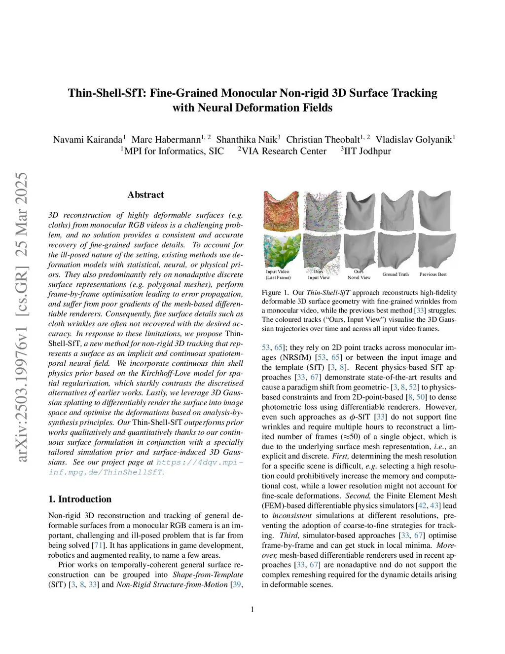 3D reconstruction of highly deformable surfaces (e.g. cloths) from monocular RGB videos is a challenging problem, and no solution provides a consistent and accurate recovery of fine-grained surface details. To account for the ill-posed nature of the setting, existing methods use deformation models with statistical, neural, or physical priors. They also predominantly rely on nonadaptive discrete surface representations (e.g. polygonal meshes), perform frame-by-frame optimisation leading to error propagation, and suffer from poor gradients of the mesh-based differentiable renderers. Consequently, fine surface details such as cloth wrinkles are often not recovered with the desired accuracy. In response to these limitations, we propose ThinShell-SfT, a new method for non-rigid 3D tracking that represents a surface as an implicit and continuous spatiotemporal neural field. We incorporate continuous thin shell physics prior based on the Kirchhoff-Love model for spatial regularisation, which starkly contrasts the discretised alternatives of earlier works. Lastly, we leverage 3D Gaussian splatting to differentiably render the surface into image space and optimise the deformations based on analysis-bysynthesis principles. Our Thin-Shell-SfT outperforms prior works qualitatively and quantitatively thanks to our continuous surface formulation in conjunction with a specially tailored simulation prior and surface-induced 3D Gaussians. See our project page atthis https URL.