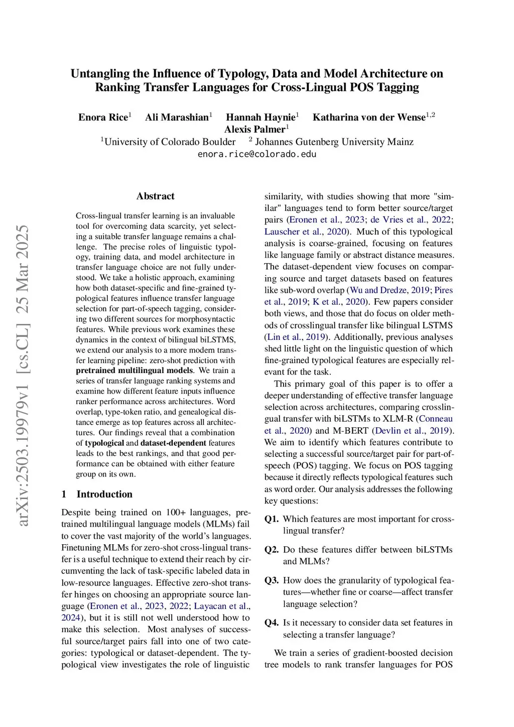 Cross-lingual transfer learning is an invaluable tool for overcoming data scarcity, yet selecting a suitable transfer language remains a challenge. The precise roles of linguistic typology, training data, and model architecture in transfer language choice are not fully understood. We take a holistic approach, examining how both dataset-specific and fine-grained typological features influence transfer language selection for part-of-speech tagging, considering two different sources for morphosyntactic features. While previous work examines these dynamics in the context of bilingual biLSTMS, we extend our analysis to a more modern transfer learning pipeline: zero-shot prediction with pretrained multilingual models. We train a series of transfer language ranking systems and examine how different feature inputs influence ranker performance across architectures. Word overlap, type-token ratio, and genealogical distance emerge as top features across all architectures. Our findings reveal that a combination of typological and dataset-dependent features leads to the best rankings, and that good performance can be obtained with either feature group on its own.