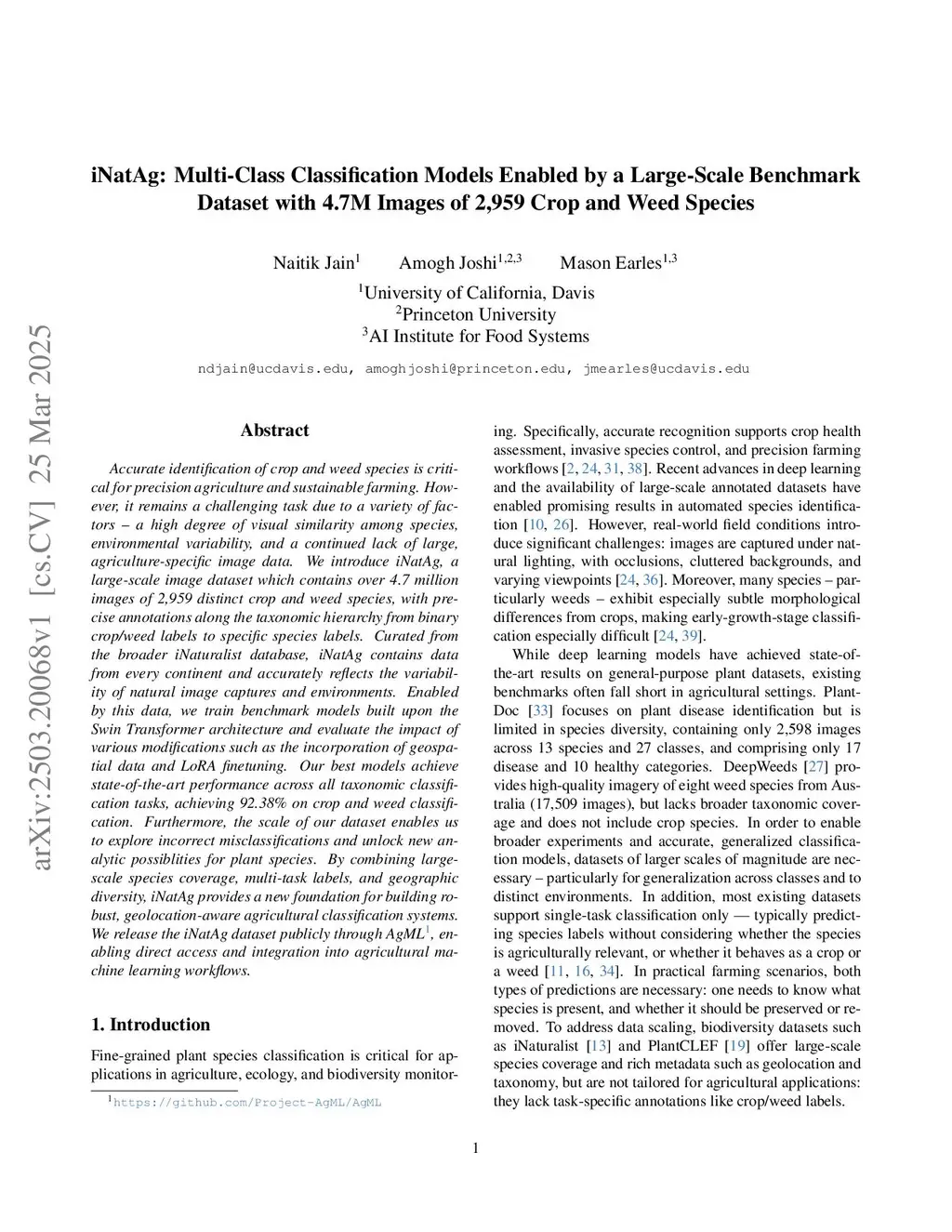iNatAg: Multi-Class Classification Models Enabled by a Large-Scale Benchmark Dataset with 4.7M Images of 2,959 Crop and Weed Species