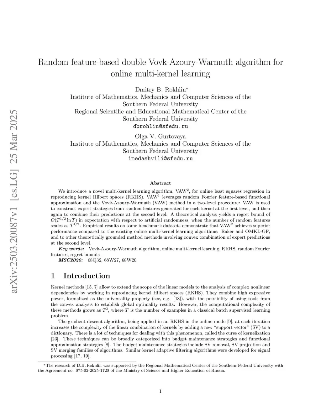 We introduce a novel multi-kernel learning algorithm, VAW, for online least squares regression in reproducing kernel Hilbert spaces (RKHS). VAW leverages random Fourier feature-based functional approximation and the Vovk-Azoury-Warmuth (VAW) method in a two-level procedure: VAW is used to construct expert strategies from random features generated for each kernel at the first level, and then again to combine their predictions at the second level. A theoretical analysis yields a regret bound of in expectation with respect to artificial randomness, when the number of random features scales as . Empirical results on some benchmark datasets demonstrate that VAW achieves superior performance compared to the existing online multi-kernel learning algorithms: Raker and OMKL-GF, and to other theoretically grounded method methods involving convex combination of expert predictions at the second level.