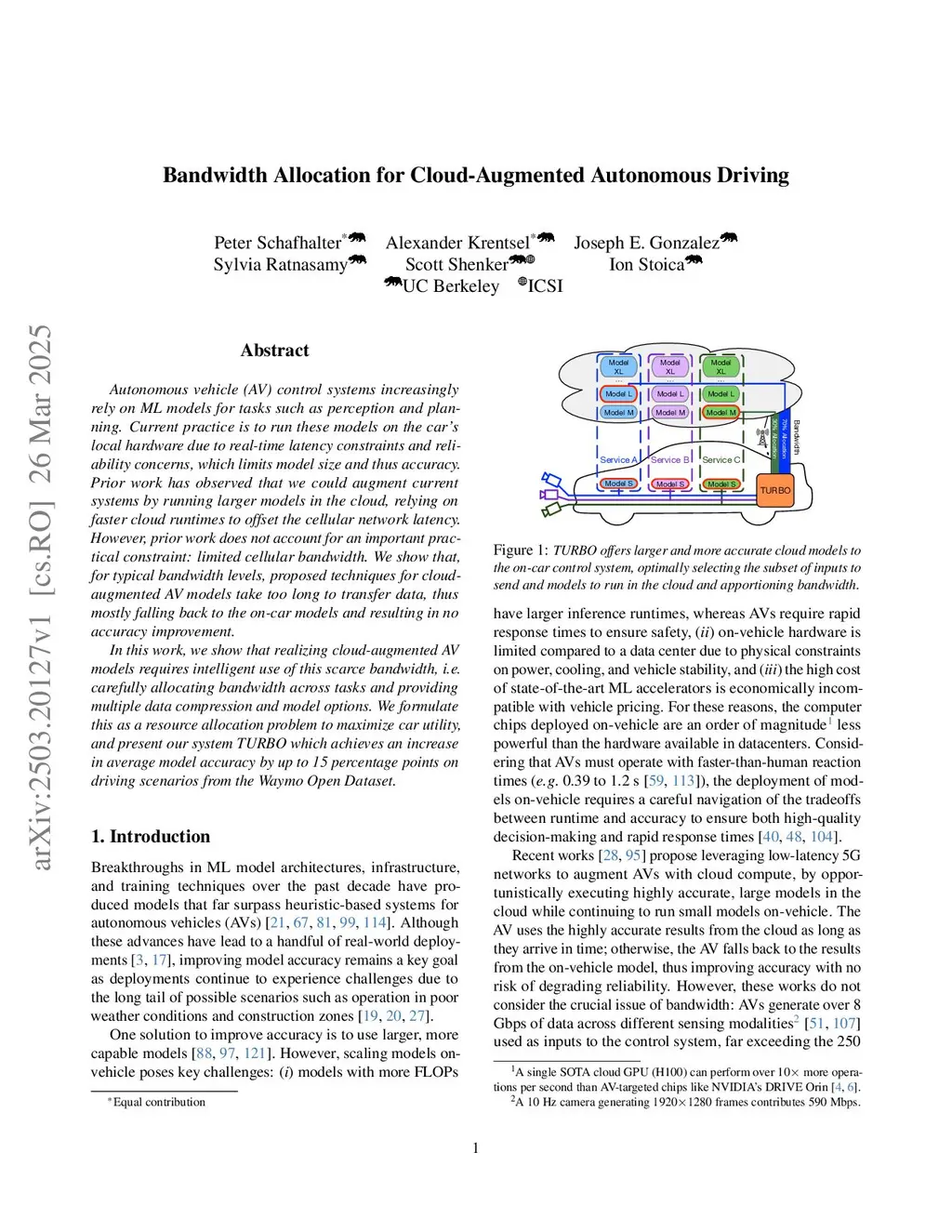 Autonomous driving system progress has been driven by improvements in machine learning models, whose computational demands now exceed what edge devices alone can provide. The cloud offers abundant compute, but the network has long been treated as an unreliable bottleneck rather than a co-equal part of the autonomous vehicle control loop. We argue that this separation is no longer tenable: safety-critical autonomy requires co-design of control, models, and network resource allocation itself.We introduce TURBO, a cloud-augmented control framework that addresses this challenge, formulating bandwidth allocation and control pipeline configuration across both the car and cloud as a joint optimization problem. TURBO maximizes benefit to the car while guaranteeing safety in the face of highly variable network conditions. We implement TURBO and evaluate it in both simulation and real-world deployment, showing it can improve average accuracy by up to 15.6%pt over existing on-vehicle-only pipelines. Our code is made available atthis http URL.