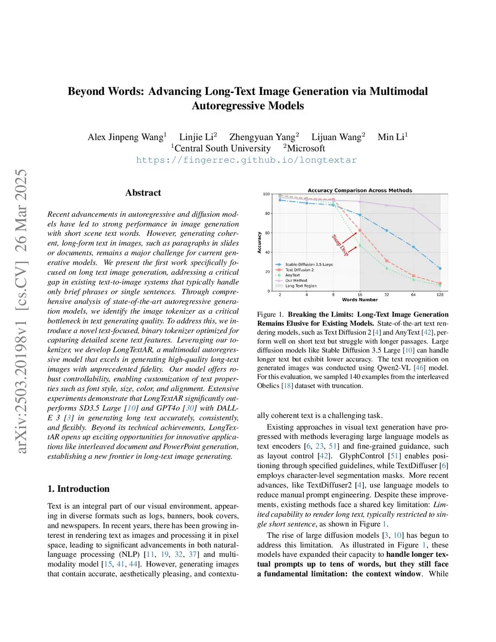 Recent advancements in autoregressive and diffusion models have led to strong performance in image generation with short scene text words. However, generating coherent, long-form text in images, such as paragraphs in slides or documents, remains a major challenge for current generative models. We present the first work specifically focused on long text image generation, addressing a critical gap in existing text-to-image systems that typically handle only brief phrases or single sentences. Through comprehensive analysis of state-of-the-art autoregressive generation models, we identify the image tokenizer as a critical bottleneck in text generating quality. To address this, we introduce a novel text-focused, binary tokenizer optimized for capturing detailed scene text features. Leveraging our tokenizer, we develop \ModelName, a multimodal autoregressive model that excels in generating high-quality long-text images with unprecedented fidelity. Our model offers robust controllability, enabling customization of text properties such as font style, size, color, and alignment. Extensive experiments demonstrate that \ModelName~significantly outperforms SD3.5 Large~\cite{sd3} and GPT4o~\cite{gpt4o} with DALL-E 3~\cite{dalle3} in generating long text accurately, consistently, and flexibly. Beyond its technical achievements, \ModelName~opens up exciting opportunities for innovative applications like interleaved document and PowerPoint generation, establishing a new frontier in long-text image generating.