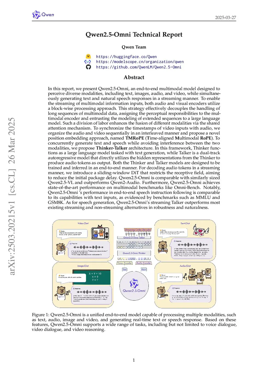 In this report, we present Qwen2.5-Omni, an end-to-end multimodal model designed to perceive diverse modalities, including text, images, audio, and video, while simultaneously generating text and natural speech responses in a streaming manner. To enable the streaming of multimodal information inputs, both audio and visual encoders utilize a block-wise processing approach. To synchronize the timestamps of video inputs with audio, we organize the audio and video sequentially in an interleaved manner and propose a novel position embedding approach, named TMRoPE(Time-aligned Multimodal RoPE). To concurrently generate text and speech while avoiding interference between the two modalities, we propose \textbf{Thinker-Talker} architecture. In this framework, Thinker functions as a large language model tasked with text generation, while Talker is a dual-track autoregressive model that directly utilizes the hidden representations from the Thinker to produce audio tokens as output. Both the Thinker and Talker models are designed to be trained and inferred in an end-to-end manner. For decoding audio tokens in a streaming manner, we introduce a sliding-window DiT that restricts the receptive field, aiming to reduce the initial package delay. Qwen2.5-Omni is comparable with the similarly sized Qwen2.5-VL and outperforms Qwen2-Audio. Furthermore, Qwen2.5-Omni achieves state-of-the-art performance on multimodal benchmarks like Omni-Bench. Notably, Qwen2.5-Omni's performance in end-to-end speech instruction following is comparable to its capabilities with text inputs, as evidenced by benchmarks such as MMLU and GSM8K. As for speech generation, Qwen2.5-Omni's streaming Talker outperforms most existing streaming and non-streaming alternatives in robustness and naturalness.