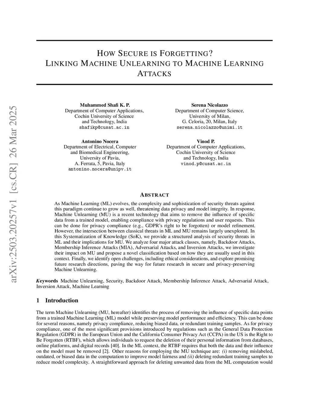 As Machine Learning (ML) evolves, the complexity and sophistication of security threats against this paradigm continue to grow as well, threatening data privacy and model integrity. In response, Machine Unlearning (MU) is a recent technology that aims to remove the influence of specific data from a trained model, enabling compliance with privacy regulations and user requests. This can be done for privacy compliance (e.g., GDPR's right to be forgotten) or model refinement. However, the intersection between classical threats in ML and MU remains largely unexplored. In this Systematization of Knowledge (SoK), we provide a structured analysis of security threats in ML and their implications for MU. We analyze four major attack classes, namely, Backdoor Attacks, Membership Inference Attacks (MIA), Adversarial Attacks, and Inversion Attacks, we investigate their impact on MU and propose a novel classification based on how they are usually used in this context. Finally, we identify open challenges, including ethical considerations, and explore promising future research directions, paving the way for future research in secure and privacy-preserving Machine Unlearning.