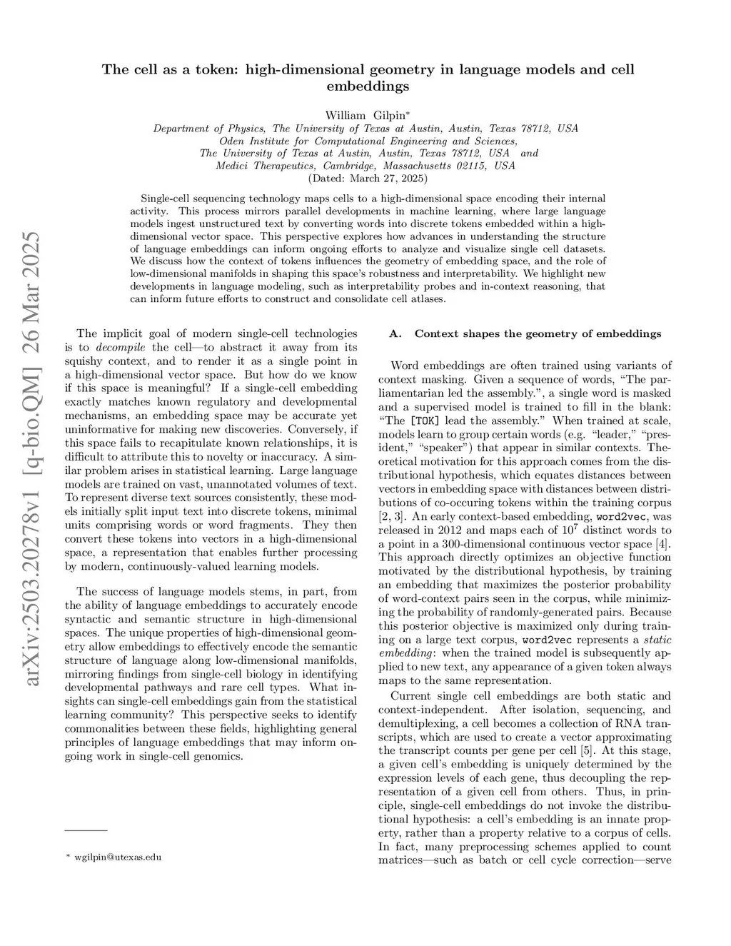 Single-cell sequencing technology maps cells to a high-dimensional space encoding their internal activity. Recently-proposed virtual cell models extend this concept, enriching cells' representations based on patterns learned from pretraining on vast cell atlases. This review explores how advances in understanding the structure of natural language embeddings informs ongoing efforts to analyze single-cell datasets. Both fields process unstructured data by partitioning datasets into tokens embedded within a high-dimensional vector space. We discuss how the context of tokens influences the geometry of embedding space, and how low-dimensional manifolds shape this space's robustness and interpretation. We highlight how new developments in foundation models for language, such as interpretability probes and in-context reasoning, can inform efforts to construct cell atlases and train virtual cell models.