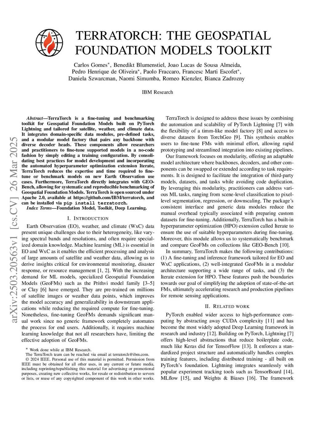 TerraTorch is a fine-tuning and benchmarking toolkit for Geospatial Foundation Models built on PyTorch Lightning and tailored for satellite, weather, and climate data. It integrates domain-specific data modules, pre-defined tasks, and a modular model factory that pairs any backbone with diverse decoder heads. These components allow researchers and practitioners to fine-tune supported models in a no-code fashion by simply editing a training configuration. By consolidating best practices for model development and incorporating the automated hyperparameter optimization extension Iterate, TerraTorch reduces the expertise and time required to fine-tune or benchmark models on new Earth Observation use cases. Furthermore, TerraTorch directly integrates with GEO-Bench, allowing for systematic and reproducible benchmarking of Geospatial Foundation Models. TerraTorch is open sourced under Apache 2.0, available atthis https URL, and can be installed via pip install terratorch.