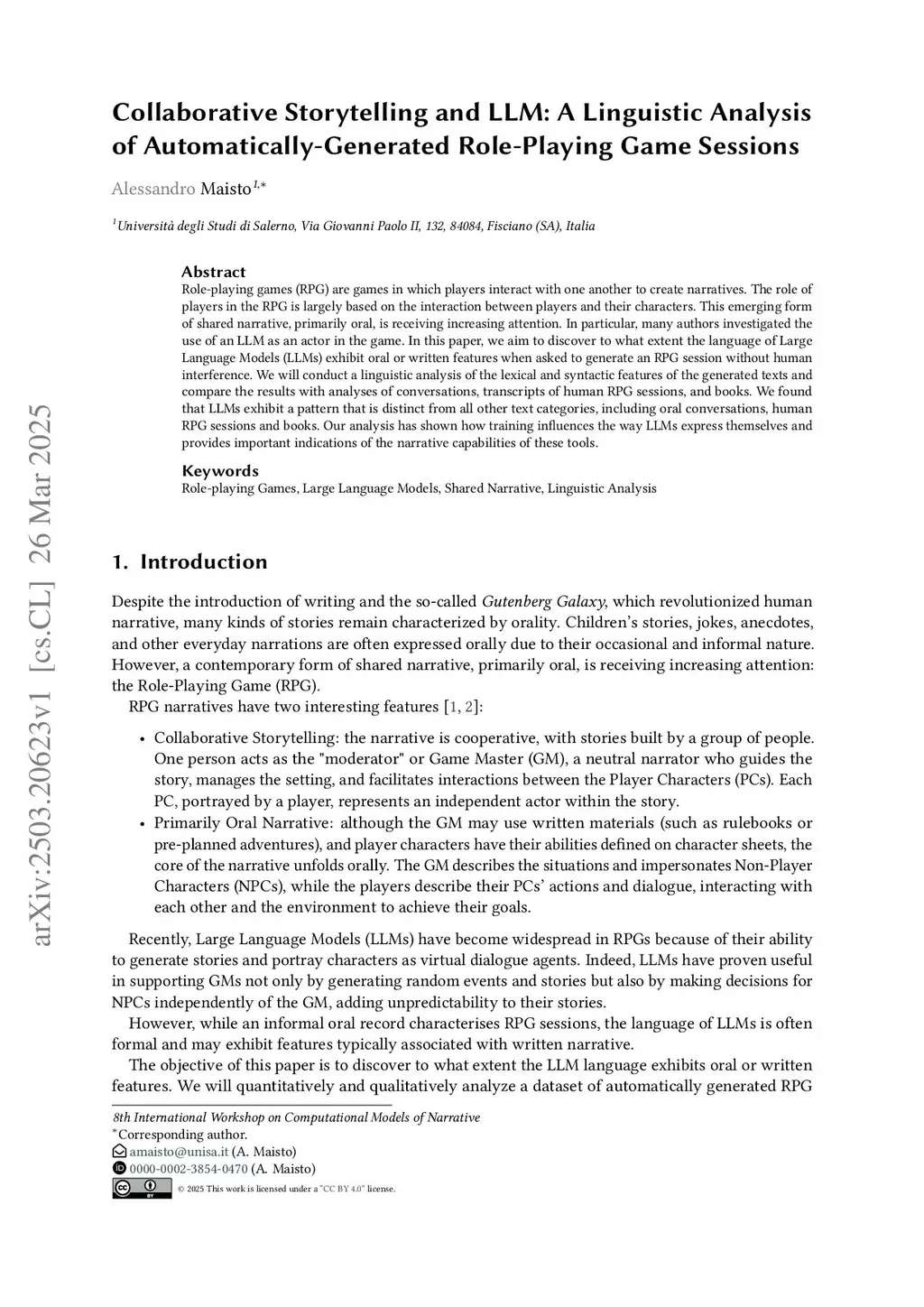 Collaborative Storytelling and LLM: A Linguistic Analysis of Automatically-Generated Role-Playing Game Sessions