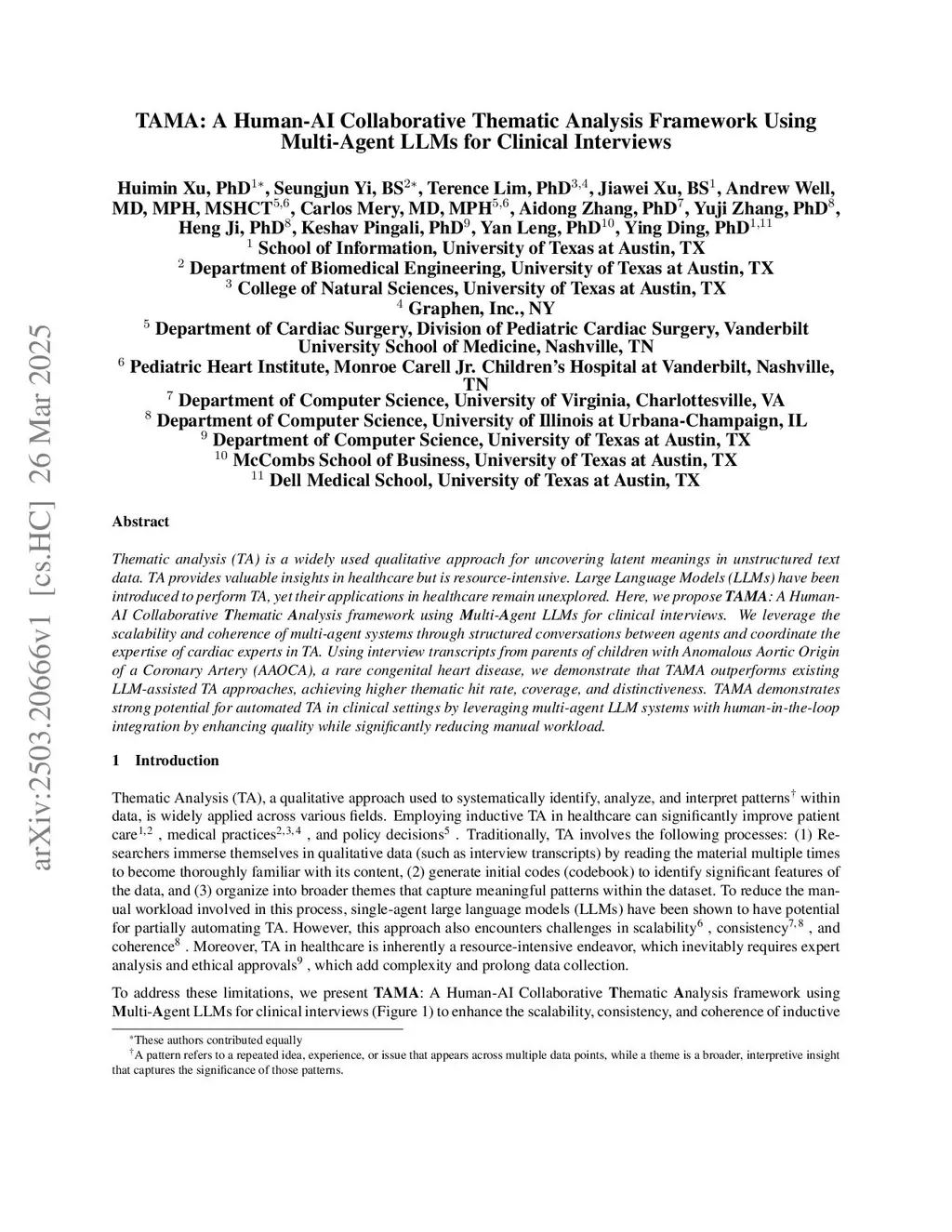 Thematic analysis (TA) is a widely used qualitative approach for uncovering latent meanings in unstructured text data. TA provides valuable insights in healthcare but is resource-intensive. Large Language Models (LLMs) have been introduced to perform TA, yet their applications in healthcare remain unexplored. Here, we propose TAMA: A Human-AI Collaborative Thematic Analysis framework using Multi-Agent LLMs for clinical interviews. We leverage the scalability and coherence of multi-agent systems through structured conversations between agents and coordinate the expertise of cardiac experts in TA. Using interview transcripts from parents of children with Anomalous Aortic Origin of a Coronary Artery (AAOCA), a rare congenital heart disease, we demonstrate that TAMA outperforms existing LLM-assisted TA approaches, achieving higher thematic hit rate, coverage, and distinctiveness. TAMA demonstrates strong potential for automated TA in clinical settings by leveraging multi-agent LLM systems with human-in-the-loop integration by enhancing quality while significantly reducing manual workload.