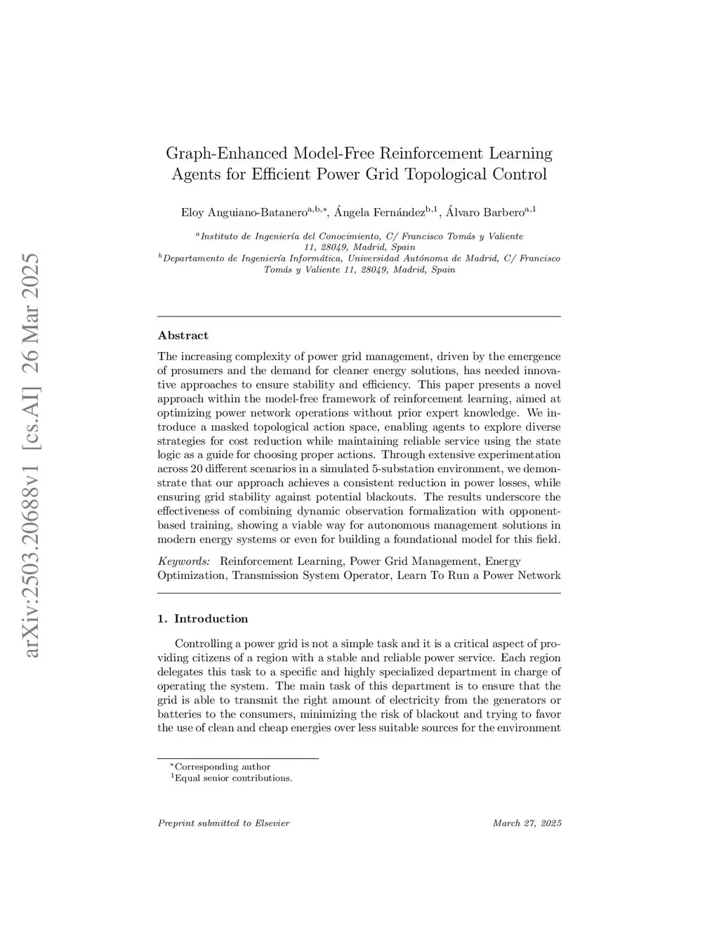 The increasing complexity of power grid management, driven by the emergence of prosumers and the demand for cleaner energy solutions, has needed innovative approaches to ensure stability and efficiency. This paper presents a novel approach within the model-free framework of reinforcement learning, aimed at optimizing power network operations without prior expert knowledge. We introduce a masked topological action space, enabling agents to explore diverse strategies for cost reduction while maintaining reliable service using the state logic as a guide for choosing proper actions. Through extensive experimentation across 20 different scenarios in a simulated 5-substation environment, we demonstrate that our approach achieves a consistent reduction in power losses, while ensuring grid stability against potential blackouts. The results underscore the effectiveness of combining dynamic observation formalization with opponent-based training, showing a viable way for autonomous management solutions in modern energy systems or even for building a foundational model for this field.