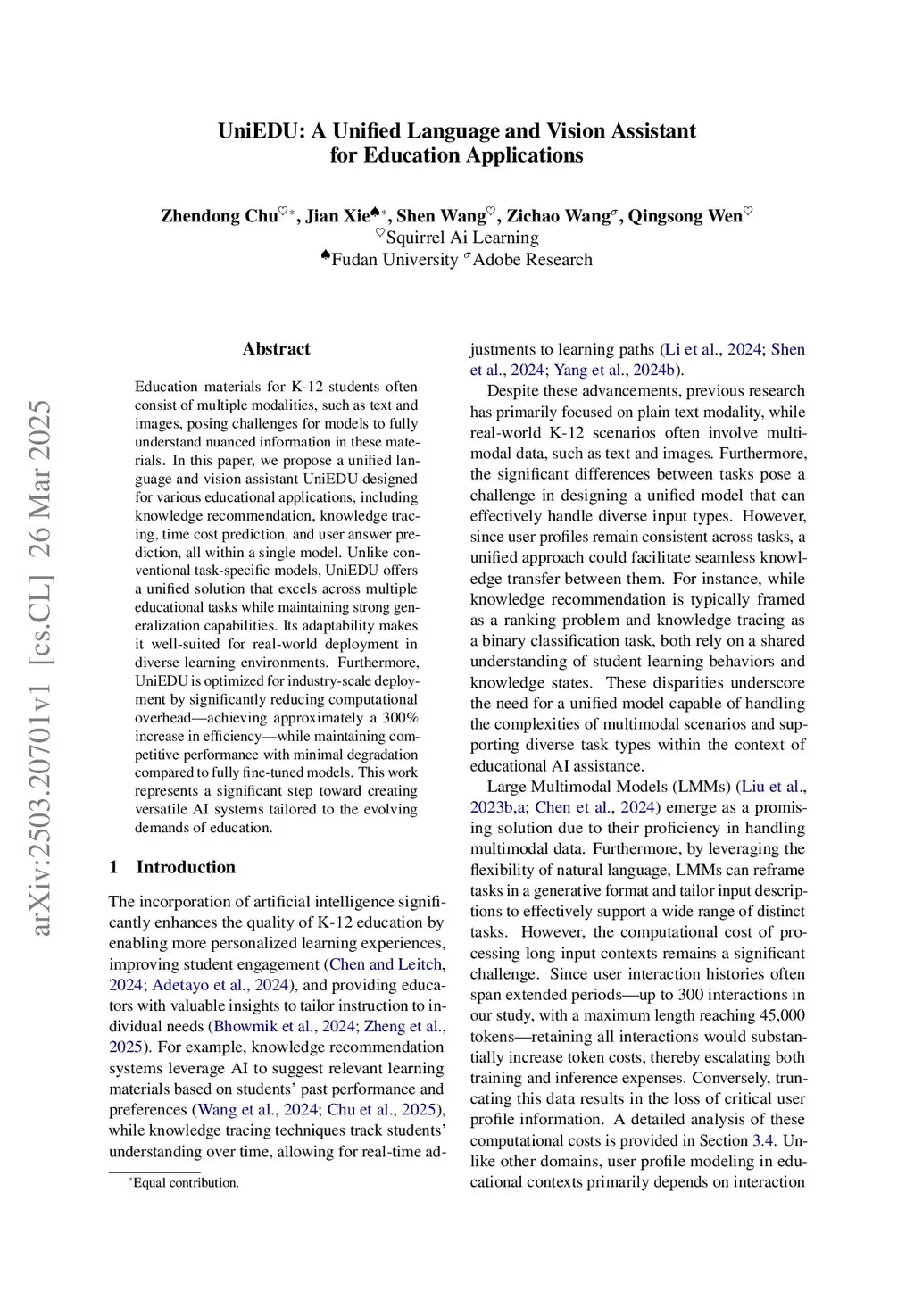 Education materials for K-12 students often consist of multiple modalities, such as text and images, posing challenges for models to fully understand nuanced information in these materials. In this paper, we propose a unified language and vision assistant UniEDU designed for various educational applications, including knowledge recommendation, knowledge tracing, time cost prediction, and user answer prediction, all within a single model. Unlike conventional task-specific models, UniEDU offers a unified solution that excels across multiple educational tasks while maintaining strong generalization capabilities. Its adaptability makes it well-suited for real-world deployment in diverse learning environments. Furthermore, UniEDU is optimized for industry-scale deployment by significantly reducing computational overhead-achieving approximately a 300\% increase in efficiency-while maintaining competitive performance with minimal degradation compared to fully fine-tuned models. This work represents a significant step toward creating versatile AI systems tailored to the evolving demands of education.