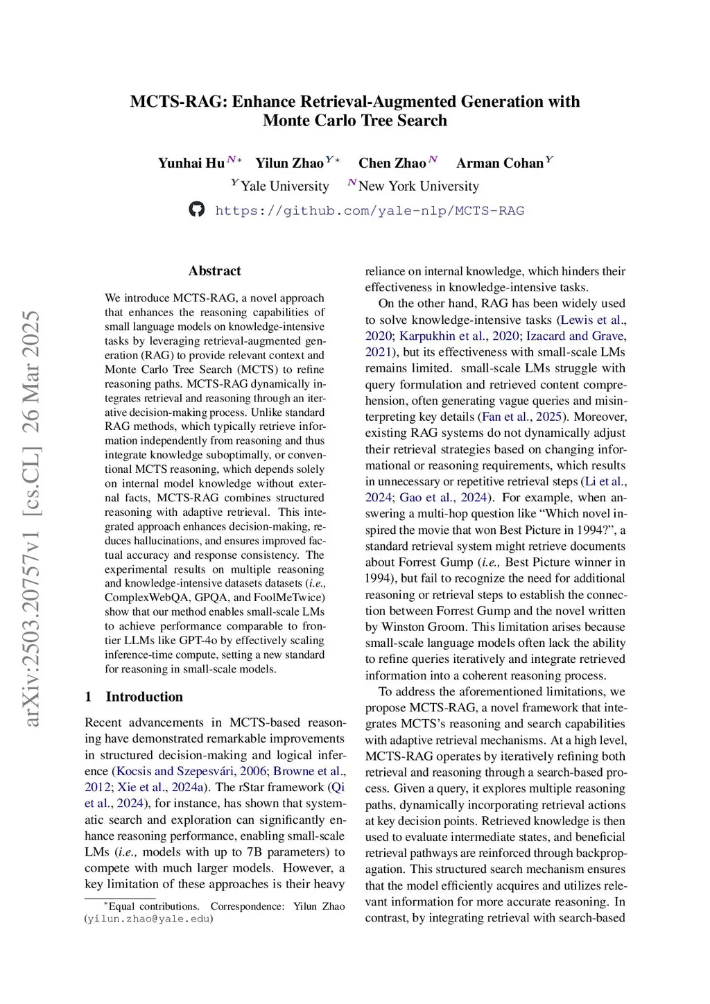 We introduce MCTS-RAG, a novel approach that enhances the reasoning capabilities of small language models on knowledge-intensive tasks by leveraging retrieval-augmented generation (RAG) to provide relevant context and Monte Carlo Tree Search (MCTS) to refine reasoning paths. MCTS-RAG dynamically integrates retrieval and reasoning through an iterative decision-making process. Unlike standard RAG methods, which typically retrieve information independently from reasoning and thus integrate knowledge suboptimally, or conventional MCTS reasoning, which depends solely on internal model knowledge without external facts, MCTS-RAG combines structured reasoning with adaptive retrieval. This integrated approach enhances decision-making, reduces hallucinations, and ensures improved factual accuracy and response consistency. The experimental results on multiple reasoning and knowledge-intensive datasets datasets (i.e., ComplexWebQA, GPQA, and FoolMeTwice) show that our method enables small-scale LMs to achieve performance comparable to frontier LLMs like GPT-4o by effectively scaling inference-time compute, setting a new standard for reasoning in small-scale models.