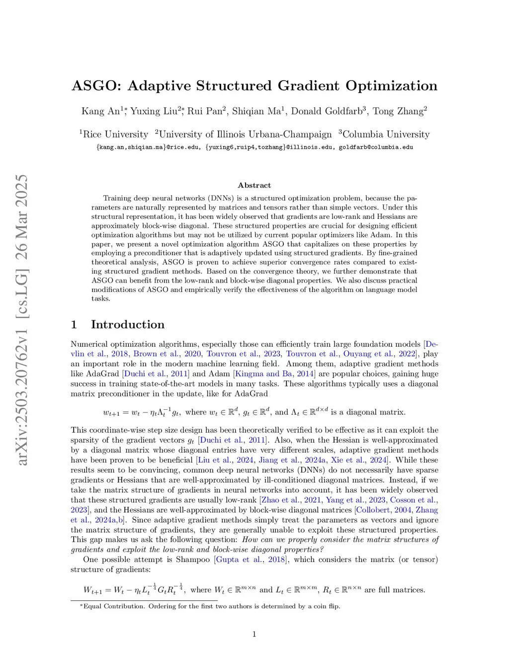 Training deep neural networks is a structured optimization problem, because the parameters are naturally represented by matrices and tensors rather than by vectors. Under this structural representation, it has been widely observed that gradients are low-rank and Hessians are approximately block diagonal. These structured properties are crucial for designing efficient optimization algorithms, but are not utilized by many current popular optimizers like Adam. In this paper, we present a novel optimization algorithm ASGO that capitalizes on these properties by employing a preconditioner that is adaptively updated using structured gradients. By a fine-grained theoretical analysis, ASGO is proven to achieve superior convergence rates compared to existing structured gradient methods. Based on this convergence theory, we further demonstrate that ASGO can benefit from low-rank gradients and block diagonal Hessians. We also discuss practical modifications of ASGO and empirically verify ASGO's effectiveness on language model tasks. Code is available atthis https URL.