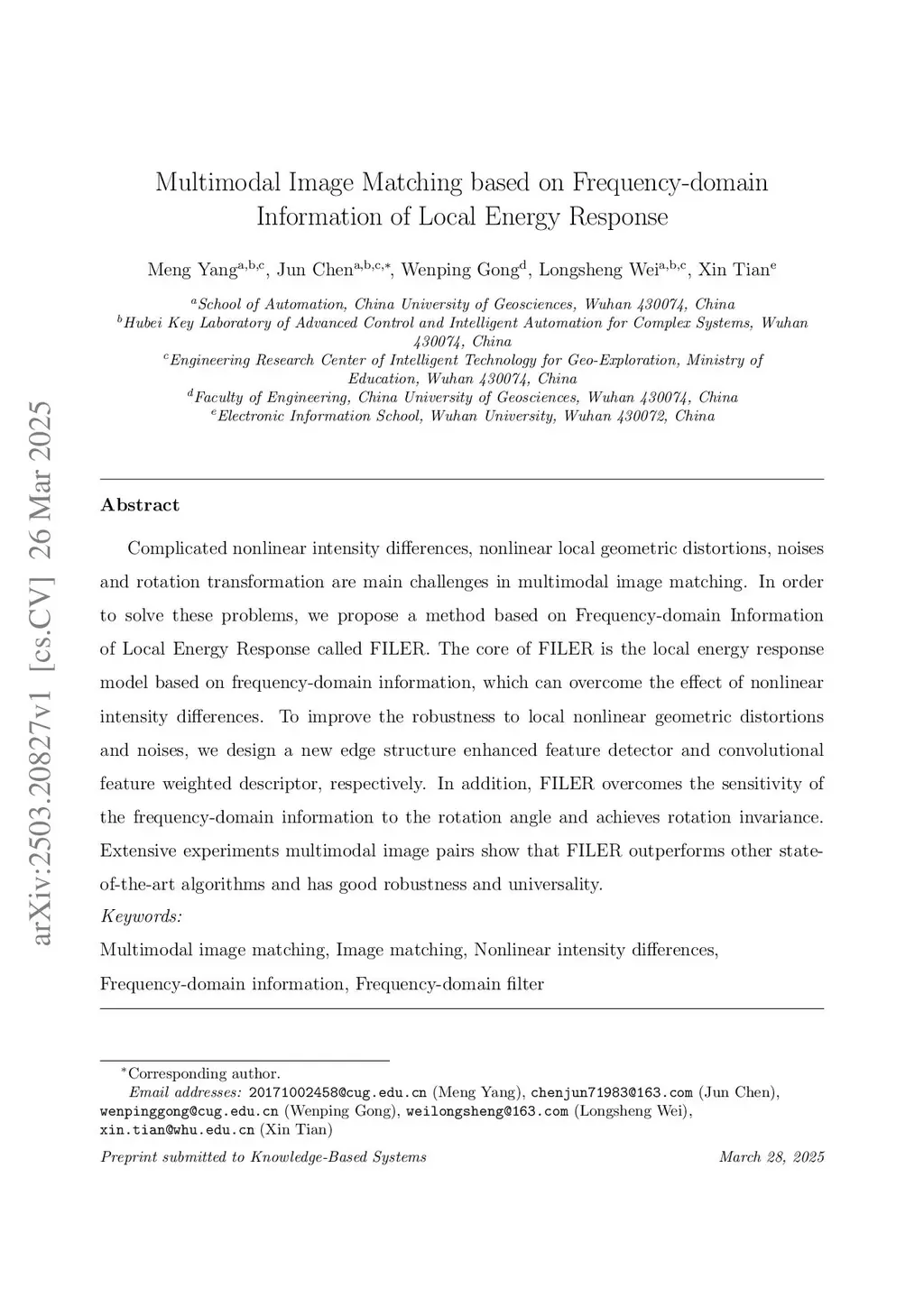 Complicated nonlinear intensity differences, nonlinear local geometric distortions, noises and rotation transformation are main challenges in multimodal image matching. In order to solve these problems, we propose a method based on Frequency-domain Information of Local Energy Response called FILER. The core of FILER is the local energy response model based on frequency-domain information, which can overcome the effect of nonlinear intensity differences. To improve the robustness to local nonlinear geometric distortions and noises, we design a new edge structure enhanced feature detector and convolutional feature weighted descriptor, respectively. In addition, FILER overcomes the sensitivity of the frequency-domain information to the rotation angle and achieves rotation invariance. Extensive experiments multimodal image pairs show that FILER outperforms other state-of-the-art algorithms and has good robustness and universality.