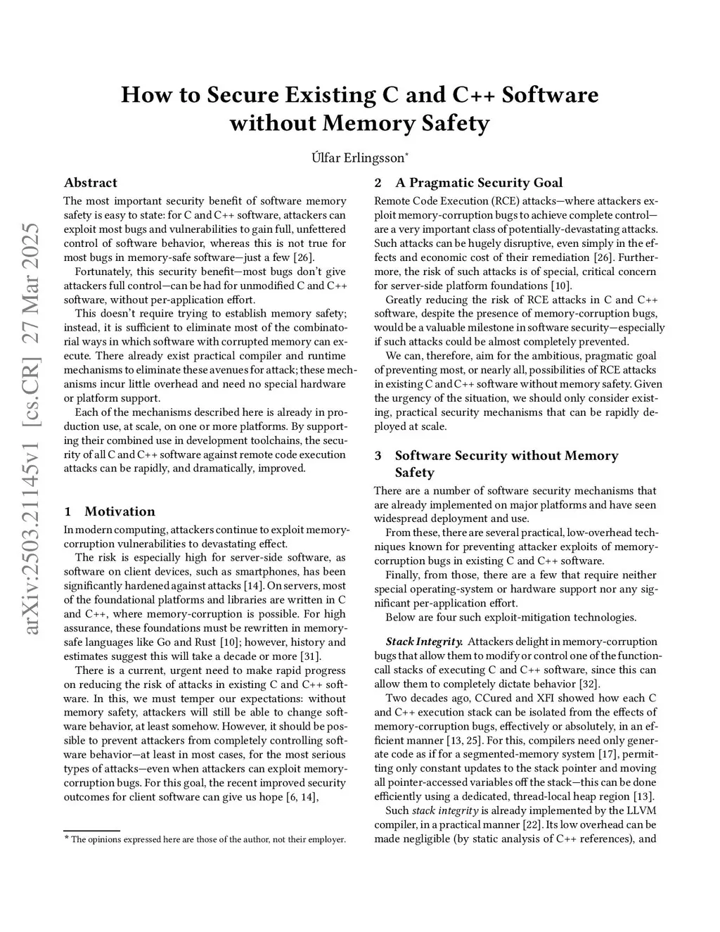 The most important security benefit of software memory safety is easy to state: for C and C++ software, attackers can exploit most bugs and vulnerabilities to gain full, unfettered control of software behavior, whereas this is not true for most bugs in memory-safe software.Fortunately, this security benefit -- most bugs don't give attackers full control -- can be had for unmodified C/C++ software, without per-application effort.This doesn't require trying to establish memory safety; instead, it is sufficient to eliminate most of the combinatorial ways in which software with corrupted memory can execute. To eliminate these interleavings, there already exist practical compiler and runtime mechanisms that incur little overhead and need no special hardware or platform support.Each of the mechanisms described here is already in production use, at scale, on one or more platforms. By supporting their combined use in development toolchains, the security of all C and C++ software against remote code execution attacks can be rapidly, and dramatically, improved.