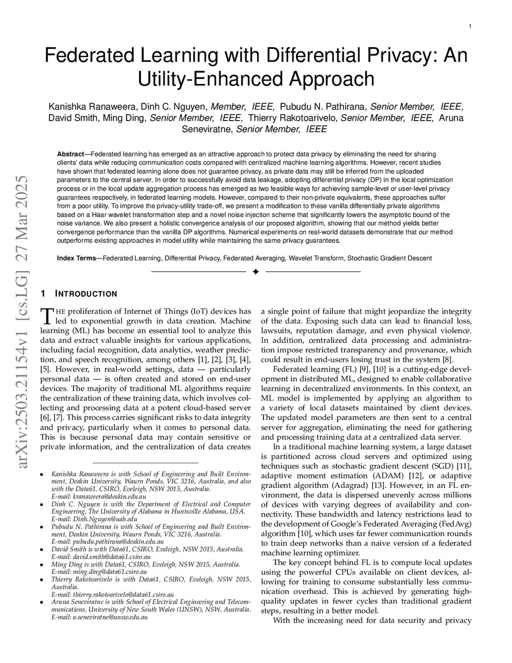 Federated learning has emerged as an attractive approach to protect data privacy by eliminating the need for sharing clients' data while reducing communication costs compared with centralized machine learning algorithms. However, recent studies have shown that federated learning alone does not guarantee privacy, as private data may still be inferred from the uploaded parameters to the central server. In order to successfully avoid data leakage, adopting differential privacy (DP) in the local optimization process or in the local update aggregation process has emerged as two feasible ways for achieving sample-level or user-level privacy guarantees respectively, in federated learning models. However, compared to their non-private equivalents, these approaches suffer from a poor utility. To improve the privacy-utility trade-off, we present a modification to these vanilla differentially private algorithms based on a Haar wavelet transformation step and a novel noise injection scheme that significantly lowers the asymptotic bound of the noise variance. We also present a holistic convergence analysis of our proposed algorithm, showing that our method yields better convergence performance than the vanilla DP algorithms. Numerical experiments on real-world datasets demonstrate that our method outperforms existing approaches in model utility while maintaining the same privacy guarantees.