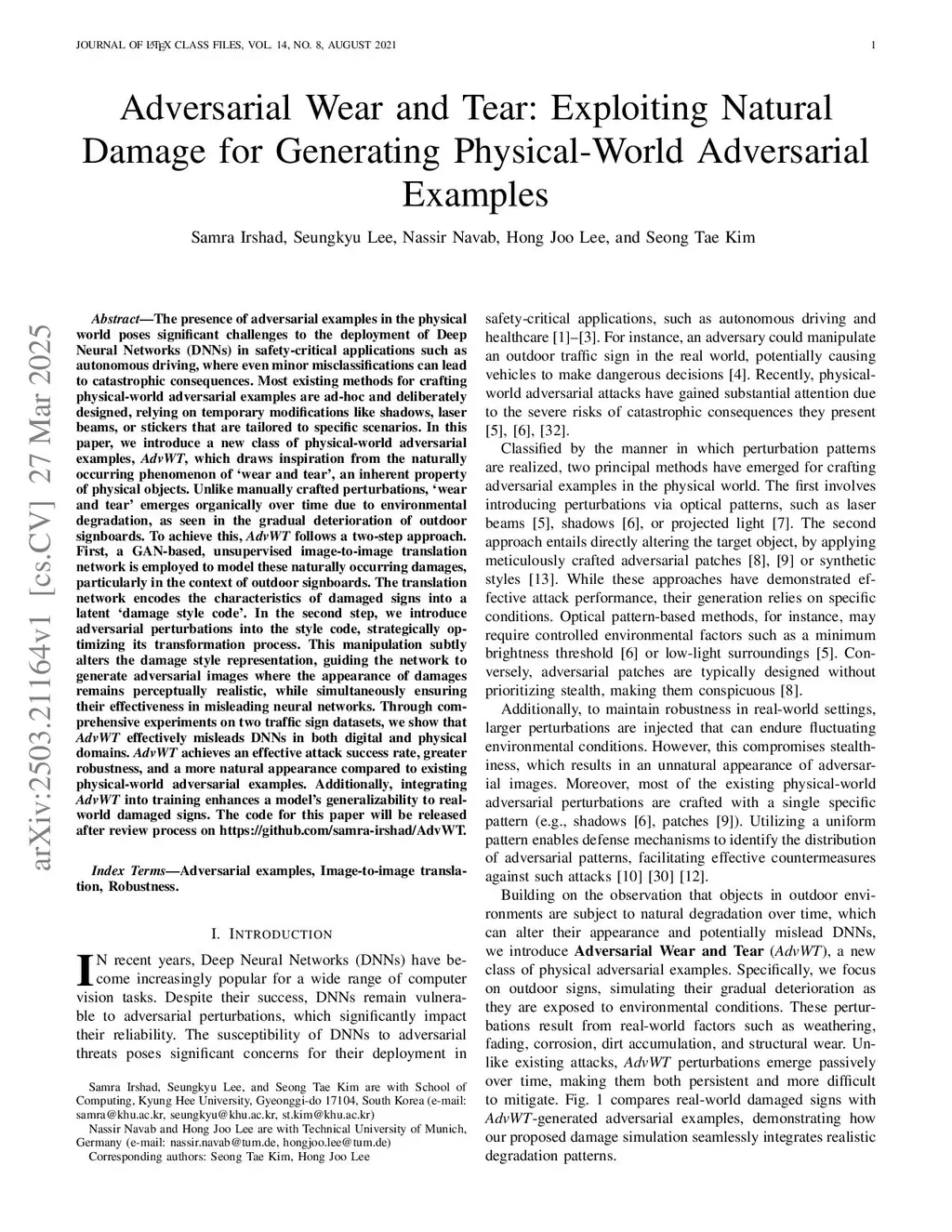 The presence of adversarial examples in the physical world poses significant challenges to the deployment of Deep Neural Networks in safety-critical applications such as autonomous driving. Most existing methods for crafting physical-world adversarial examples are ad-hoc, relying on temporary modifications like shadows, laser beams, or stickers that are tailored to specific scenarios. In this paper, we introduce a new class of physical-world adversarial examples, AdvWT, which draws inspiration from the naturally occurring phenomenon of `wear and tear', an inherent property of physical objects. Unlike manually crafted perturbations, `wear and tear' emerges organically over time due to environmental degradation, as seen in the gradual deterioration of outdoor signboards. To achieve this, AdvWT follows a two-step approach. First, a GAN-based, unsupervised image-to-image translation network is employed to model these naturally occurring damages, particularly in the context of outdoor signboards. The translation network encodes the characteristics of damaged signs into a latent `damage style code'. In the second step, we introduce adversarial perturbations into the style code, strategically optimizing its transformation process. This manipulation subtly alters the damage style representation, guiding the network to generate adversarial images where the appearance of damages remains perceptually realistic, while simultaneously ensuring their effectiveness in misleading neural networks. Through comprehensive experiments on two traffic sign datasets, we show that AdvWT effectively misleads DNNs in both digital and physical domains. AdvWT achieves an effective attack success rate, greater robustness, and a more natural appearance compared to existing physical-world adversarial examples. Additionally, integrating AdvWT into training enhances a model's generalizability to real-world damaged signs.