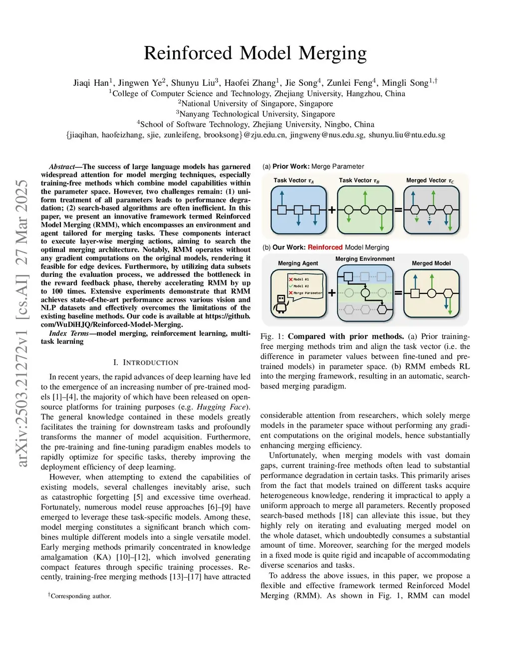 The success of large language models has garnered widespread attention for model merging techniques, especially training-free methods which combine model capabilities within the parameter space. However, two challenges remain: (1) uniform treatment of all parameters leads to performance degradation; (2) search-based algorithms are often inefficient. In this paper, we present an innovative framework termed Reinforced Model Merging (RMM), which encompasses an environment and agent tailored for merging tasks. These components interact to execute layer-wise merging actions, aiming to search the optimal merging architecture. Notably, RMM operates without any gradient computations on the original models, rendering it feasible for edge devices. Furthermore, by utilizing data subsets during the evaluation process, we addressed the bottleneck in the reward feedback phase, thereby accelerating RMM by up to 100 times. Extensive experiments demonstrate that RMM achieves state-of-the-art performance across various vision and NLP datasets and effectively overcomes the limitations of the existing baseline methods. Our code is available atthis https URL.