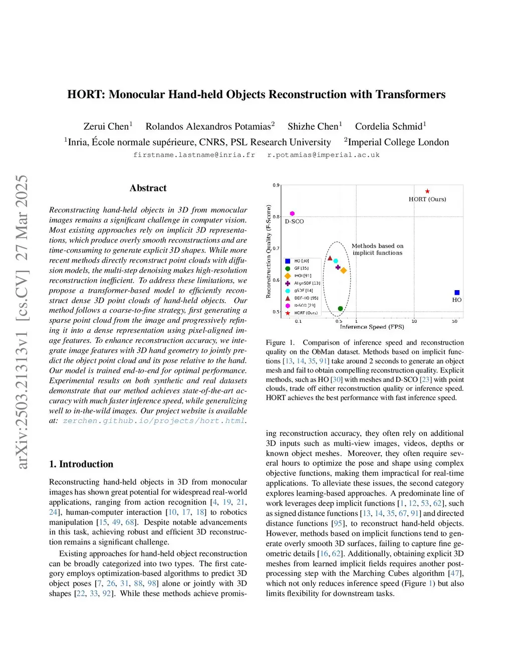 HORT: Monocular Hand-held Objects Reconstruction with Transformers