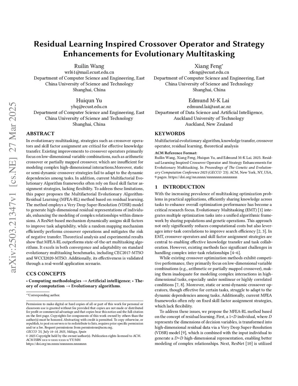 In evolutionary multitasking, strategies such as crossover operators and skill factor assignment are critical for effective knowledge transfer. Existing improvements to crossover operators primarily focus on low-dimensional variable combinations, such as arithmetic crossover or partially mapped crossover, which are insufficient for modeling complex high-dimensionalthis http URL, static or semi-dynamic crossover strategies fail to adapt to the dynamic dependencies among tasks. In addition, current Multifactorial Evolutionary Algorithm frameworks often rely on fixed skill factor assignment strategies, lacking flexibility. To address these limitations, this paper proposes the Multifactorial Evolutionary Algorithm-Residual Learning (MFEA-RL) method based on residual learning. The method employs a Very Deep Super-Resolution (VDSR) model to generate high-dimensional residual representations of individuals, enhancing the modeling of complex relationships within dimensions. A ResNet-based mechanism dynamically assigns skill factors to improve task adaptability, while a random mapping mechanism efficiently performs crossover operations and mitigates the risk of negative transfer. Theoretical analysis and experimental results show that MFEA-RL outperforms state-of-the-art multitasking algorithms. It excels in both convergence and adaptability on standard evolutionary multitasking benchmarks, including CEC2017-MTSO and WCCI2020-MTSO. Additionally, its effectiveness is validated through a real-world application scenario.