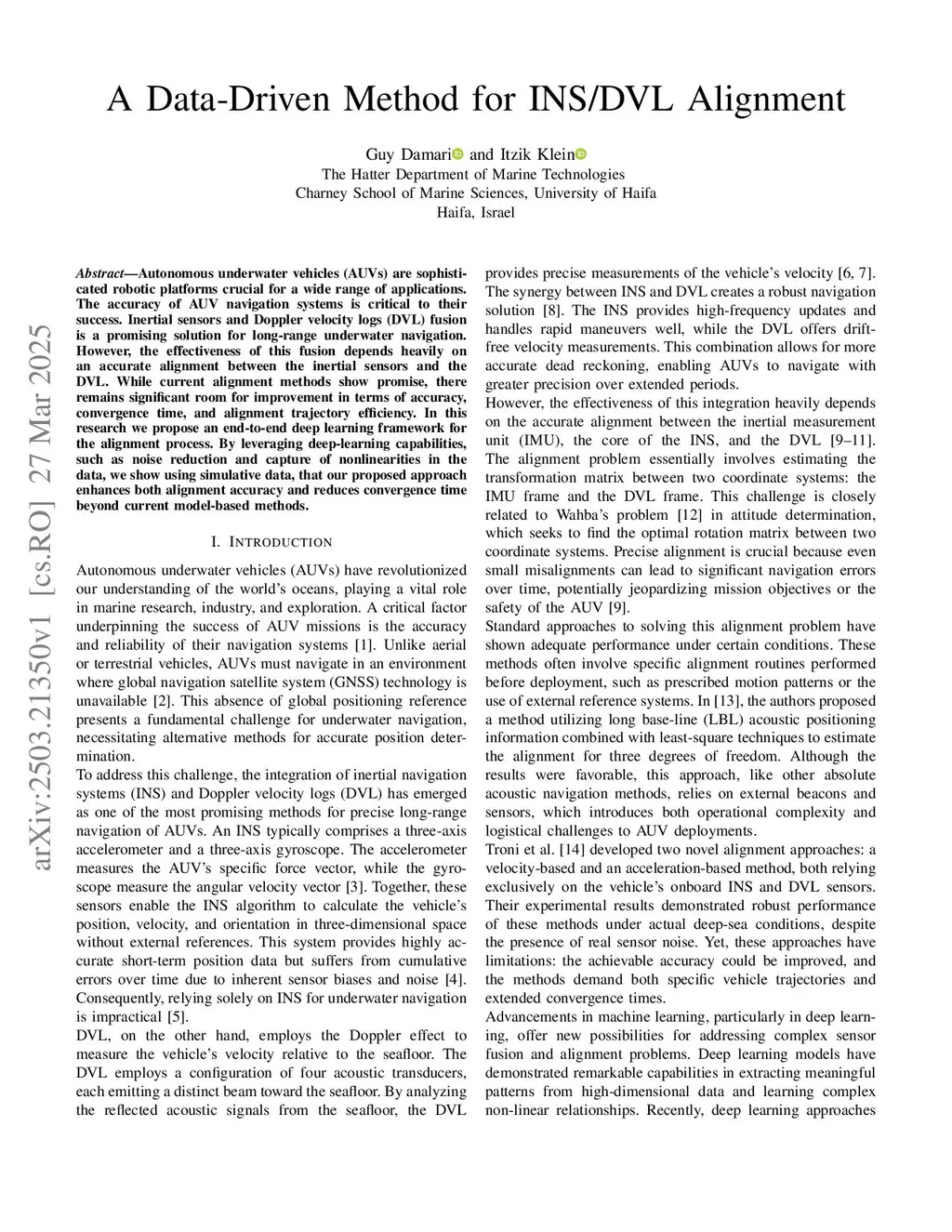 Autonomous underwater vehicles (AUVs) are sophisticated robotic platforms crucial for a wide range of applications. The accuracy of AUV navigation systems is critical to their success. Inertial sensors and Doppler velocity logs (DVL) fusion is a promising solution for long-range underwater navigation. However, the effectiveness of this fusion depends heavily on an accurate alignment between the inertial sensors and the DVL. While current alignment methods show promise, there remains significant room for improvement in terms of accuracy, convergence time, and alignment trajectory efficiency. In this research we propose an end-to-end deep learning framework for the alignment process. By leveraging deep-learning capabilities, such as noise reduction and capture of nonlinearities in the data, we show using simulative data, that our proposed approach enhances both alignment accuracy and reduces convergence time beyond current model-based methods.