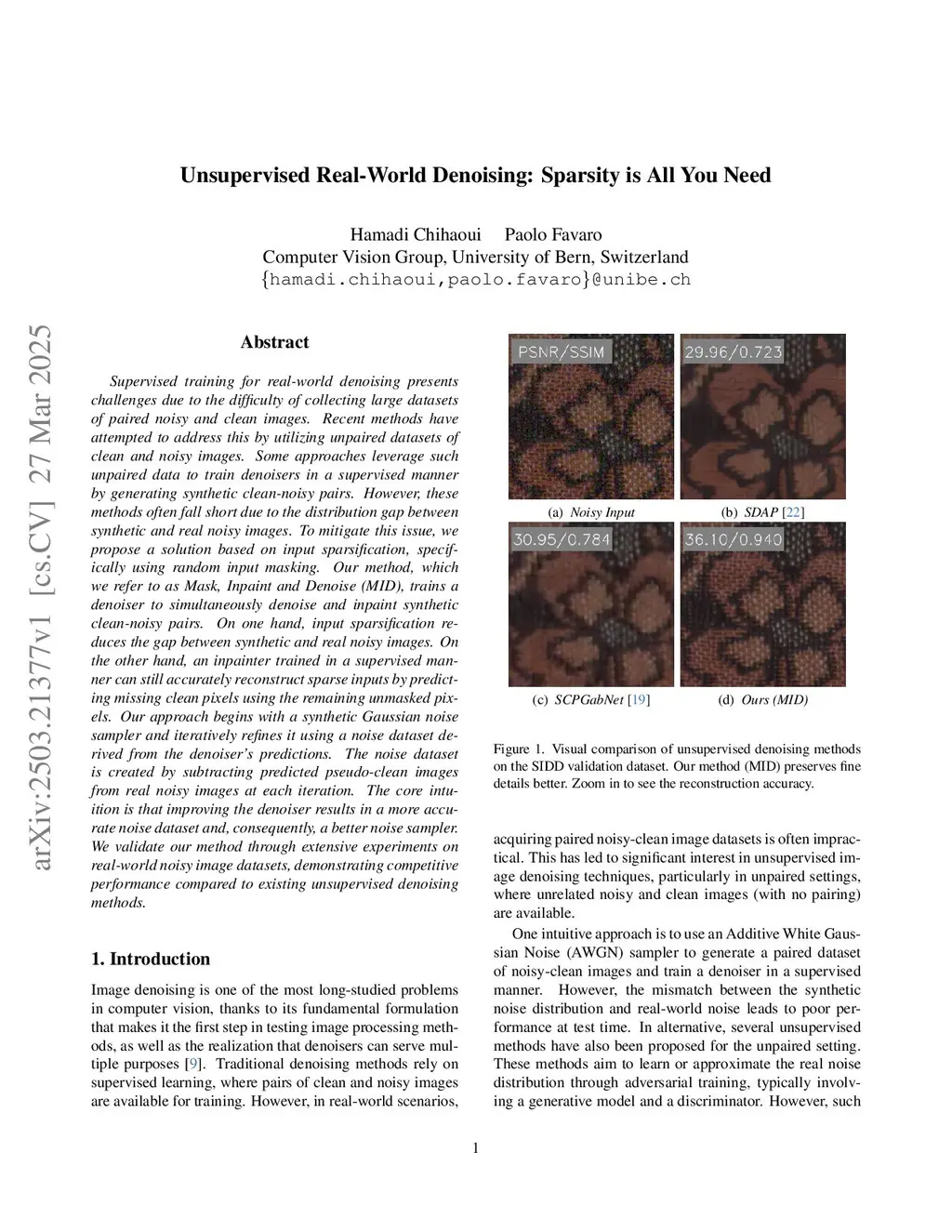 Supervised training for real-world denoising presents challenges due to the difficulty of collecting large datasets of paired noisy and clean images. Recent methods have attempted to address this by utilizing unpaired datasets of clean and noisy images. Some approaches leverage such unpaired data to train denoisers in a supervised manner by generating synthetic clean-noisy pairs. However, these methods often fall short due to the distribution gap between synthetic and real noisy images. To mitigate this issue, we propose a solution based on input sparsification, specifically using random input masking. Our method, which we refer to as Mask, Inpaint and Denoise (MID), trains a denoiser to simultaneously denoise and inpaint synthetic clean-noisy pairs. On one hand, input sparsification reduces the gap between synthetic and real noisy images. On the other hand, an inpainter trained in a supervised manner can still accurately reconstruct sparse inputs by predicting missing clean pixels using the remaining unmasked pixels. Our approach begins with a synthetic Gaussian noise sampler and iteratively refines it using a noise dataset derived from the denoiser's predictions. The noise dataset is created by subtracting predicted pseudo-clean images from real noisy images at each iteration. The core intuition is that improving the denoiser results in a more accurate noise dataset and, consequently, a better noise sampler. We validate our method through extensive experiments on real-world noisy image datasets, demonstrating competitive performance compared to existing unsupervised denoising methods.