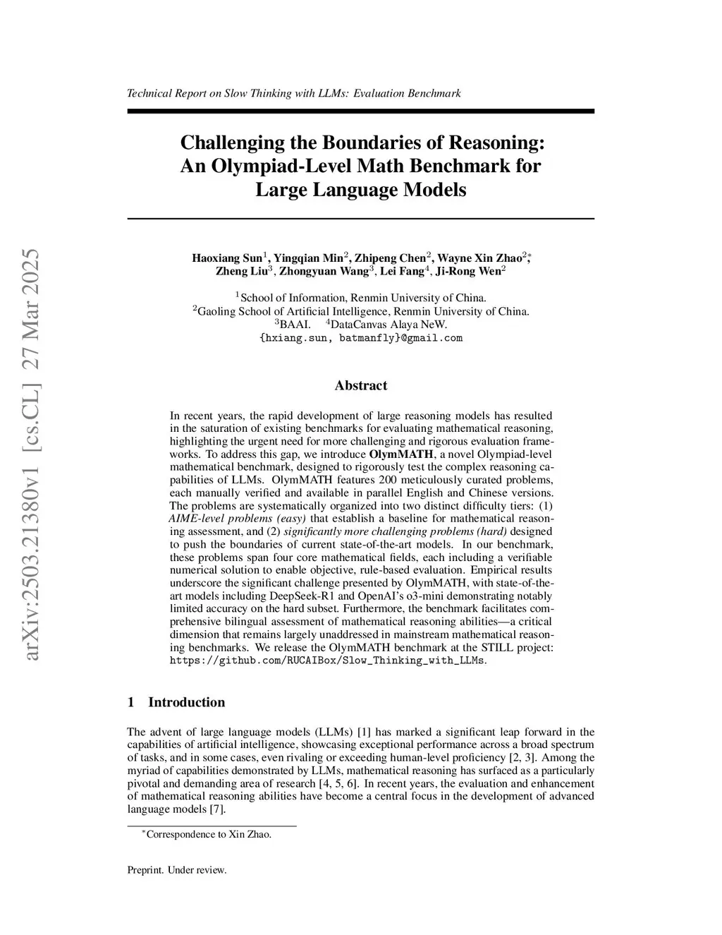 In recent years, the rapid development of large reasoning models has resulted in the saturation of existing benchmarks for evaluating mathematical reasoning, highlighting the urgent need for more challenging and rigorous evaluation frameworks. To address this gap, we introduce OlymMATH, a novel Olympiad-level mathematical benchmark, designed to rigorously test the complex reasoning capabilities of LLMs. OlymMATH features 200 meticulously curated problems, each manually verified and available in parallel English and Chinese versions. The problems are systematically organized into two distinct difficulty tiers: (1) AIME-level problems (easy) that establish a baseline for mathematical reasoning assessment, and (2) significantly more challenging problems (hard) designed to push the boundaries of current state-of-the-art models. In our benchmark, these problems span four core mathematical fields, each including a verifiable numerical solution to enable objective, rule-based evaluation. Empirical results underscore the significant challenge presented by OlymMATH, with state-of-the-art models including DeepSeek-R1, OpenAI's o3-mini and Gemini 2.5 Pro Exp demonstrating notably limited accuracy on the hard subset. Furthermore, the benchmark facilitates comprehensive bilingual assessment of mathematical reasoning abilities-a critical dimension that remains largely unaddressed in mainstream mathematical reasoning benchmarks. We release the benchmark, evaluation code, detailed results and a data visualization tool atthis https URL.