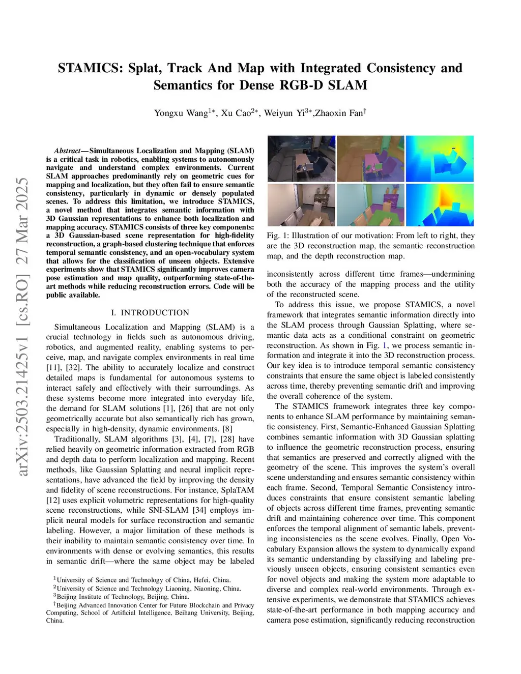 Simultaneous Localization and Mapping (SLAM) is a critical task in robotics, enabling systems to autonomously navigate and understand complex environments. Current SLAM approaches predominantly rely on geometric cues for mapping and localization, but they often fail to ensure semantic consistency, particularly in dynamic or densely populated scenes. To address this limitation, we introduce STAMICS, a novel method that integrates semantic information with 3D Gaussian representations to enhance both localization and mapping accuracy. STAMICS consists of three key components: a 3D Gaussian-based scene representation for high-fidelity reconstruction, a graph-based clustering technique that enforces temporal semantic consistency, and an open-vocabulary system that allows for the classification of unseen objects. Extensive experiments show that STAMICS significantly improves camera pose estimation and map quality, outperforming state-of-the-art methods while reducing reconstruction errors. Code will be public available.