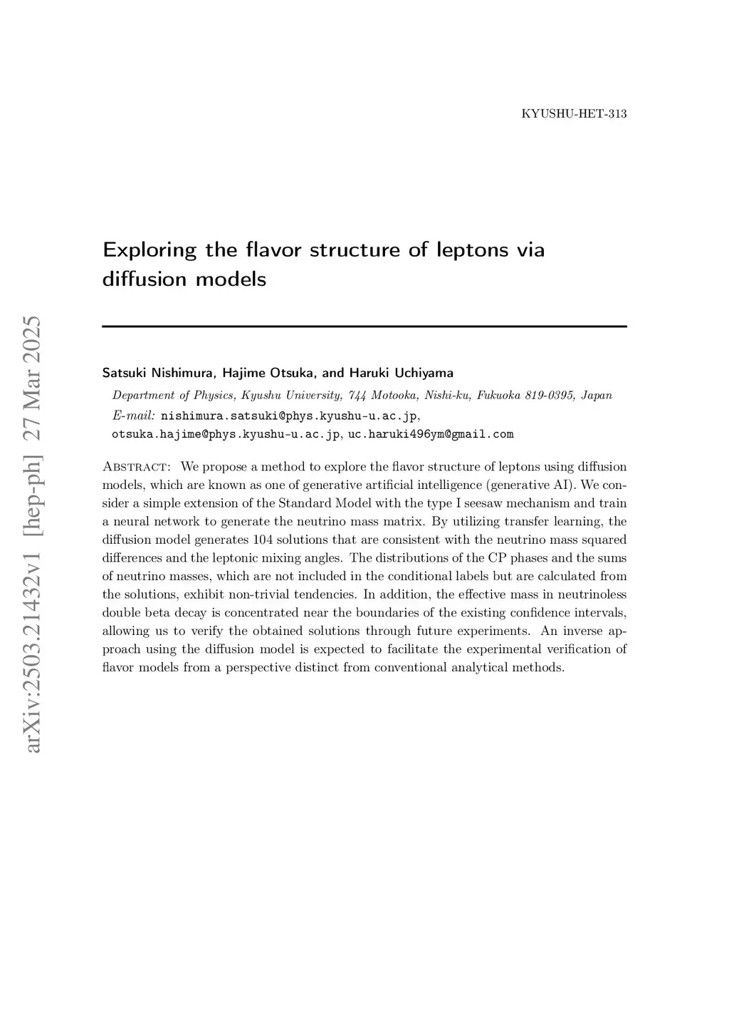 We propose a method to explore the flavor structure of leptons using diffusion models, which are known as one of generative artificial intelligence (generative AI). We consider a simple extension of the Standard Model with the type I seesaw mechanism and train a neural network to generate the neutrino mass matrix. By utilizing transfer learning, the diffusion model generates 104 solutions that are consistent with the neutrino mass squared differences and the leptonic mixing angles. The distributions of the CP phases and the sums of neutrino masses, which are not included in the conditional labels but are calculated from the solutions, exhibit non-trivial tendencies. In addition, the effective mass in neutrinoless double beta decay is concentrated near the boundaries of the existing confidence intervals, allowing us to verify the obtained solutions through future experiments. An inverse approach using the diffusion model is expected to facilitate the experimental verification of flavor models from a perspective distinct from conventional analytical methods.