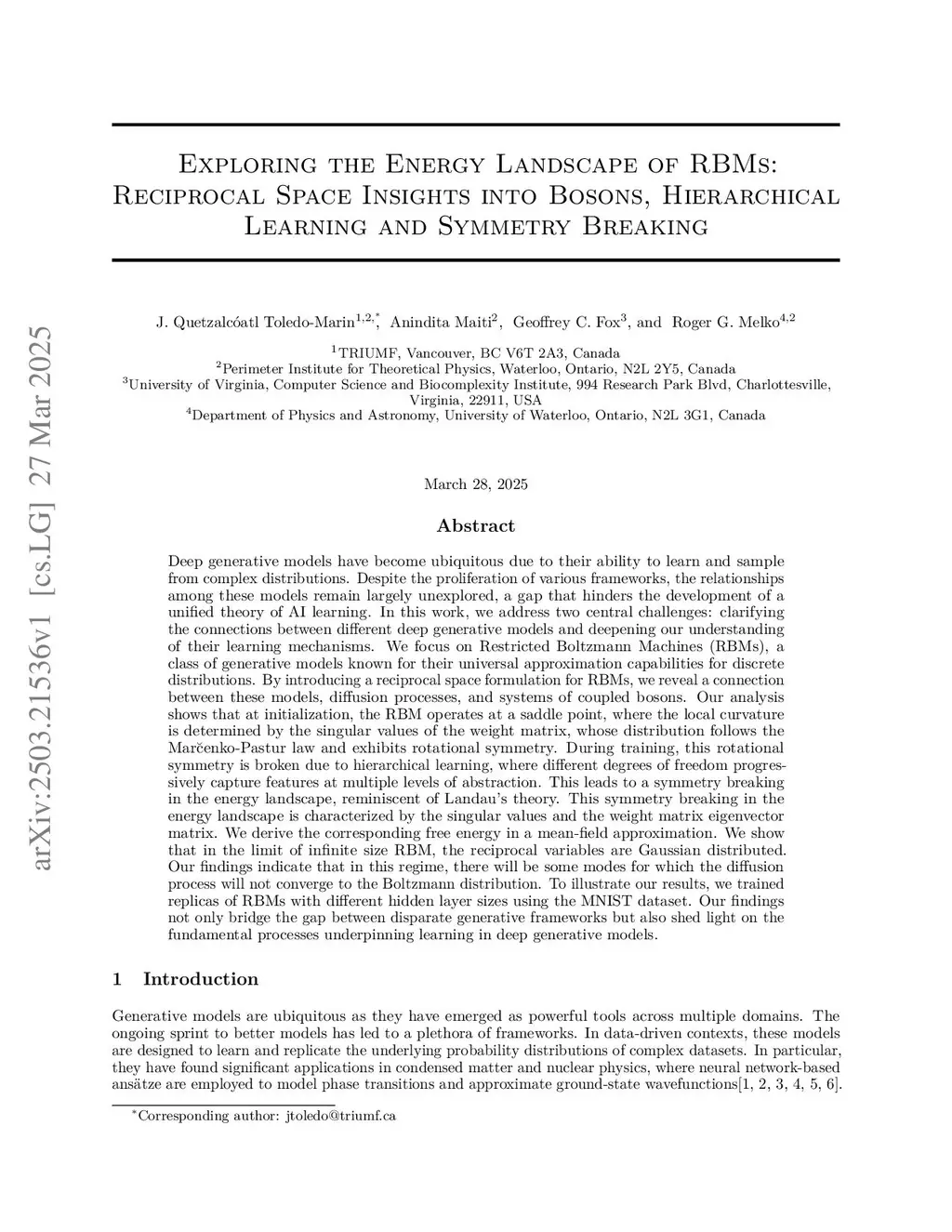 Deep generative models have become ubiquitous due to their ability to learn and sample from complex distributions. Despite the proliferation of various frameworks, the relationships among these models remain largely unexplored, a gap that hinders the development of a unified theory of AI learning. We address two central challenges: clarifying the connections between different deep generative models and deepening our understanding of their learning mechanisms. We focus on Restricted Boltzmann Machines (RBMs), known for their universal approximation capabilities for discrete distributions. By introducing a reciprocal space formulation, we reveal a connection between RBMs, diffusion processes, and coupled Bosons. We show that at initialization, the RBM operates at a saddle point, where the local curvature is determined by the singular values, whose distribution follows the Marcenko-Pastur law and exhibits rotational symmetry. During training, this rotational symmetry is broken due to hierarchical learning, where different degrees of freedom progressively capture features at multiple levels of abstraction. This leads to a symmetry breaking in the energy landscape, reminiscent of Landau theory. This symmetry breaking in the energy landscape is characterized by the singular values and the weight matrix eigenvector matrix. We derive the corresponding free energy in a mean-field approximation. We show that in the limit of infinite size RBM, the reciprocal variables are Gaussian distributed. Our findings indicate that in this regime, there will be some modes for which the diffusion process will not converge to the Boltzmann distribution. To illustrate our results, we trained replicas of RBMs with different hidden layer sizes using the MNIST dataset. Our findings bridge the gap between disparate generative frameworks and also shed light on the processes underpinning learning in generative models.