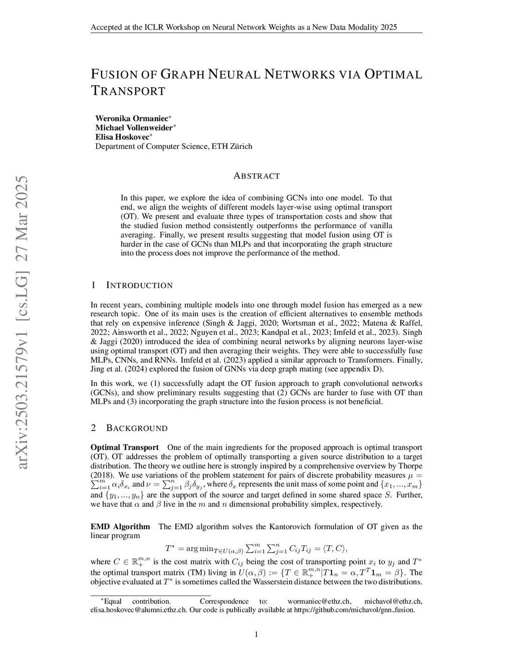 In this paper, we explore the idea of combining GCNs into one model. To that end, we align the weights of different models layer-wise using optimal transport (OT). We present and evaluate three types of transportation costs and show that the studied fusion method consistently outperforms the performance of vanilla averaging. Finally, we present results suggesting that model fusion using OT is harder in the case of GCNs than MLPs and that incorporating the graph structure into the process does not improve the performance of the method.