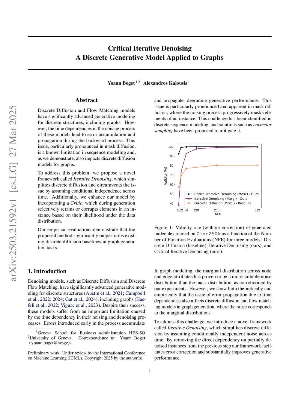 Discrete Diffusion and Flow Matching models have significantly advanced generative modeling for discrete structures, including graphs. However, the dependencies between intermediate noisy states lead to error accumulation and propagation during the reverse denoising process - a phenomenon known as compounding denoising errors. To address this problem, we propose a novel framework called Simple Iterative Denoising, which simplifies discrete diffusion and circumvents the issue by assuming conditional independence between intermediate states. Additionally, we enhance our model by incorporating a Critic. During generation, the Critic selectively retains or corrupts elements in an instance based on their likelihood under the data distribution. Our empirical evaluations demonstrate that the proposed method significantly outperforms existing discrete diffusion baselines in graph generation tasks.