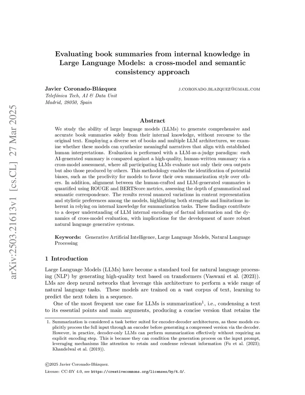 We study the ability of large language models (LLMs) to generate comprehensive and accurate book summaries solely from their internal knowledge, without recourse to the original text. Employing a diverse set of books and multiple LLM architectures, we examine whether these models can synthesize meaningful narratives that align with established human interpretations. Evaluation is performed with a LLM-as-a-judge paradigm: each AI-generated summary is compared against a high-quality, human-written summary via a cross-model assessment, where all participating LLMs evaluate not only their own outputs but also those produced by others. This methodology enables the identification of potential biases, such as the proclivity for models to favor their own summarization style over others. In addition, alignment between the human-crafted and LLM-generated summaries is quantified using ROUGE and BERTScore metrics, assessing the depth of grammatical and semantic correspondence. The results reveal nuanced variations in content representation and stylistic preferences among the models, highlighting both strengths and limitations inherent in relying on internal knowledge for summarization tasks. These findings contribute to a deeper understanding of LLM internal encodings of factual information and the dynamics of cross-model evaluation, with implications for the development of more robust natural language generative systems.