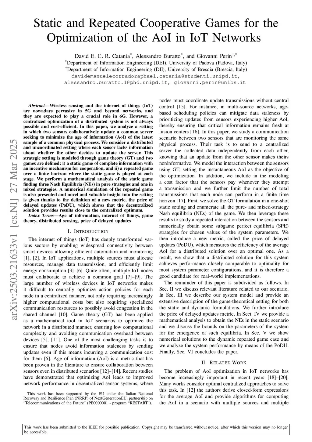 Wireless sensing and the internet of things (IoT) are nowadays pervasive in 5G and beyond networks, and they are expected to play a crucial role in 6G. However, a centralized optimization of a distributed system is not always possible and cost-efficient. In this paper, we analyze a setting in which two sensors collaboratively update a common server seeking to minimize the age of information (AoI) of the latest sample of a common physical process. We consider a distributed and uncoordinated setting where each sensor lacks information about whether the other decides to update the server. This strategic setting is modeled through game theory (GT) and two games are defined: i) a static game of complete information with an incentive mechanism for cooperation, and ii) a repeated game over a finite horizon where the static game is played at each stage. We perform a mathematical analysis of the static game finding three Nash Equilibria (NEs) in pure strategies and one in mixed strategies. A numerical simulation of the repeated game is also presented and novel and valuable insight into the setting is given thanks to the definition of a new metric, the price of delayed updates (PoDU), which shows that the decentralized solution provides results close to the centralized optimum.