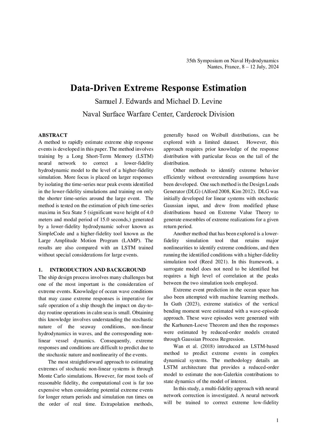 A method to rapidly estimate extreme ship response events is developed in this paper. The method involves training by a Long Short-Term Memory (LSTM) neural network to correct a lower-fidelity hydrodynamic model to the level of a higher-fidelity simulation. More focus is placed on larger responses by isolating the time-series near peak events identified in the lower-fidelity simulations and training on only the shorter time-series around the large event. The method is tested on the estimation of pitch time-series maxima in Sea State 5 (significant wave height of 4.0 meters and modal period of 15.0 seconds,) generated by a lower-fidelity hydrodynamic solver known as SimpleCode and a higher-fidelity tool known as the Large Amplitude Motion Program (LAMP). The results are also compared with an LSTM trained without special considerations for large events.